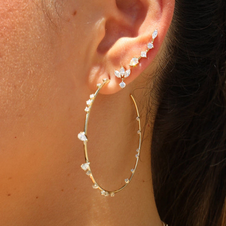Crafted in 14KT Gold, weighing 1.22 grams, and set with 0.53 carats of diamonds. Measures 6x9mm and sold as a single earring.