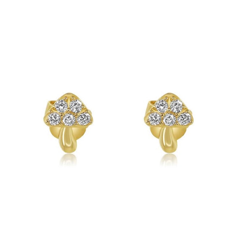 The Gold Diamond Mini Mushroom Earring by Monisha Melwani is a whimsical and charming piece. Featuring a mushroom design with diamonds, this earring is perfect for adding a unique and playful touch to any outfit.