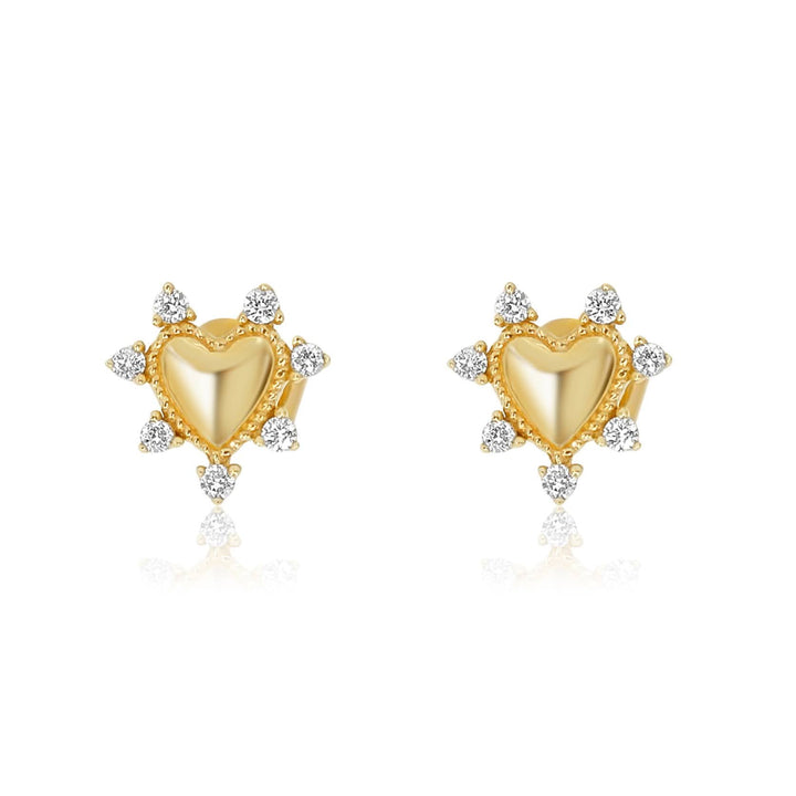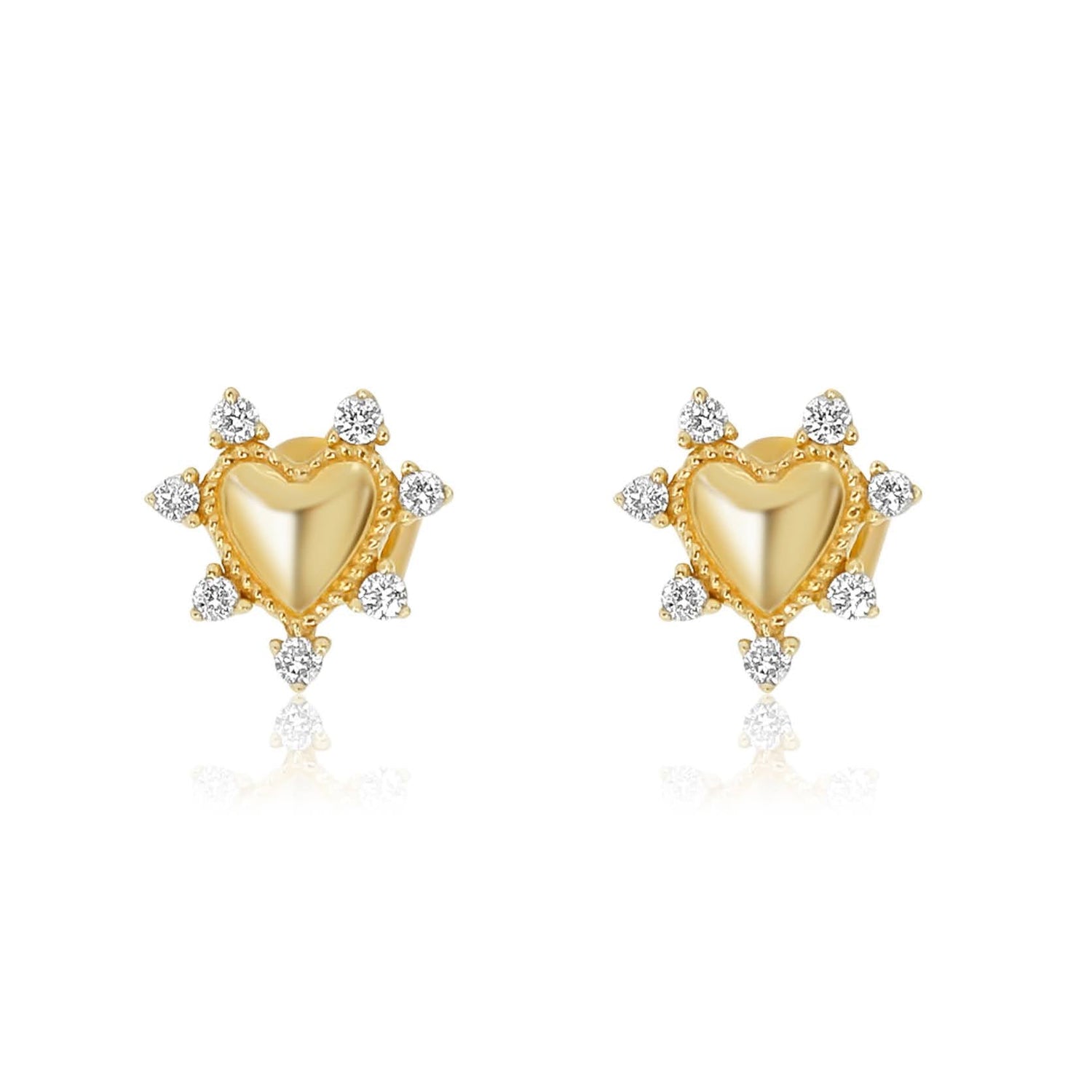 This Gold Diamond Prong Heart Earring by Monisha Melwani is a timeless symbol of love and elegance. The heart-shaped design, adorned with diamonds, makes it a perfect gift or personal treasure. Its delicate size ensures it can be worn every day or for special occasions.
