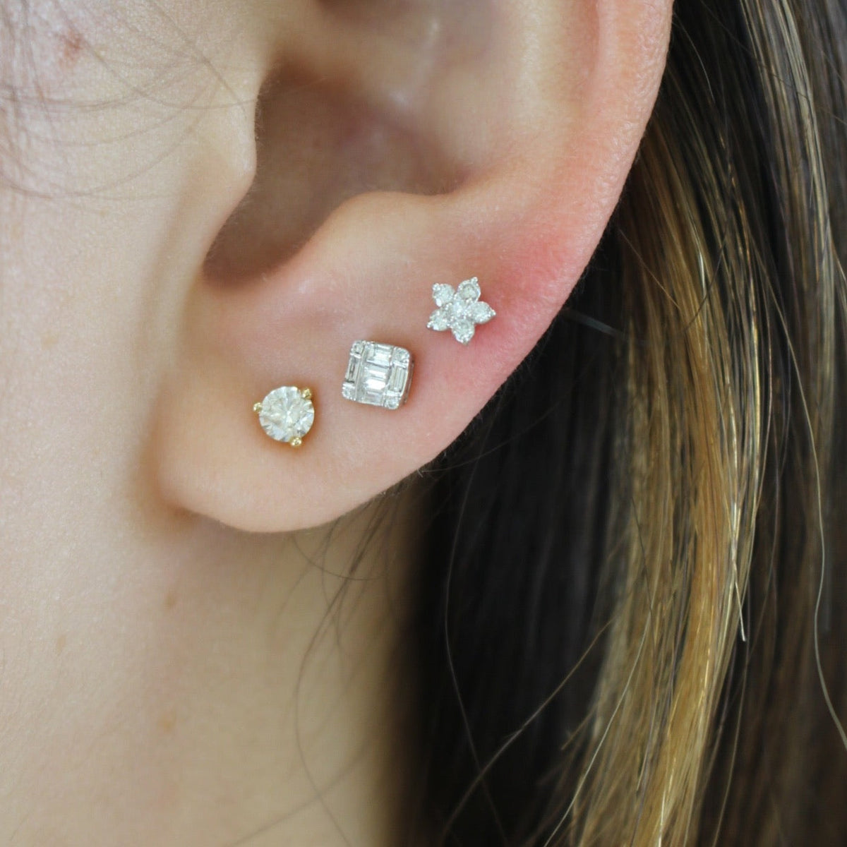 Crafted in 14KT gold and set with diamonds totaling 0.15 and 0.30 carats. The earring weighs 0.48 grams and measures 3mm. Sold as a single piece.