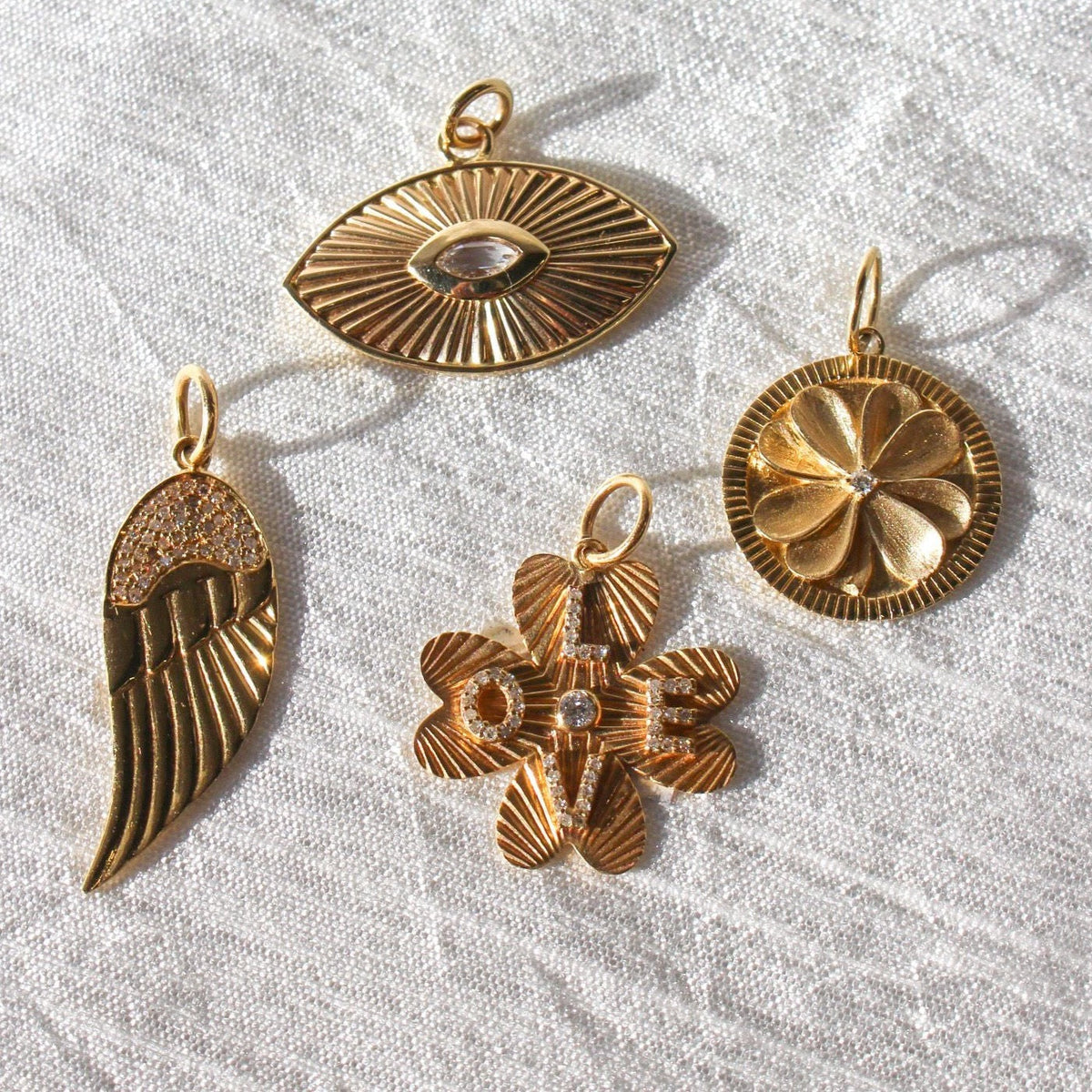 Handcrafted in 14KT yellow gold and set with diamonds, this pendant measures 1 inch.