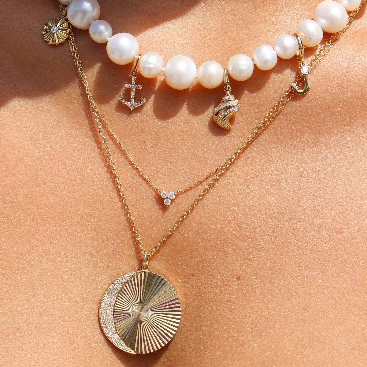This Gold Diamond Seashell Charm by Monisha Melwani beautifully captures the essence of the ocean with its elegant seashell design. Crafted in luxurious 14K yellow gold and adorned with sparkling diamonds, this charm is perfect for adding a touch of coastal elegance to any necklace or bracelet.