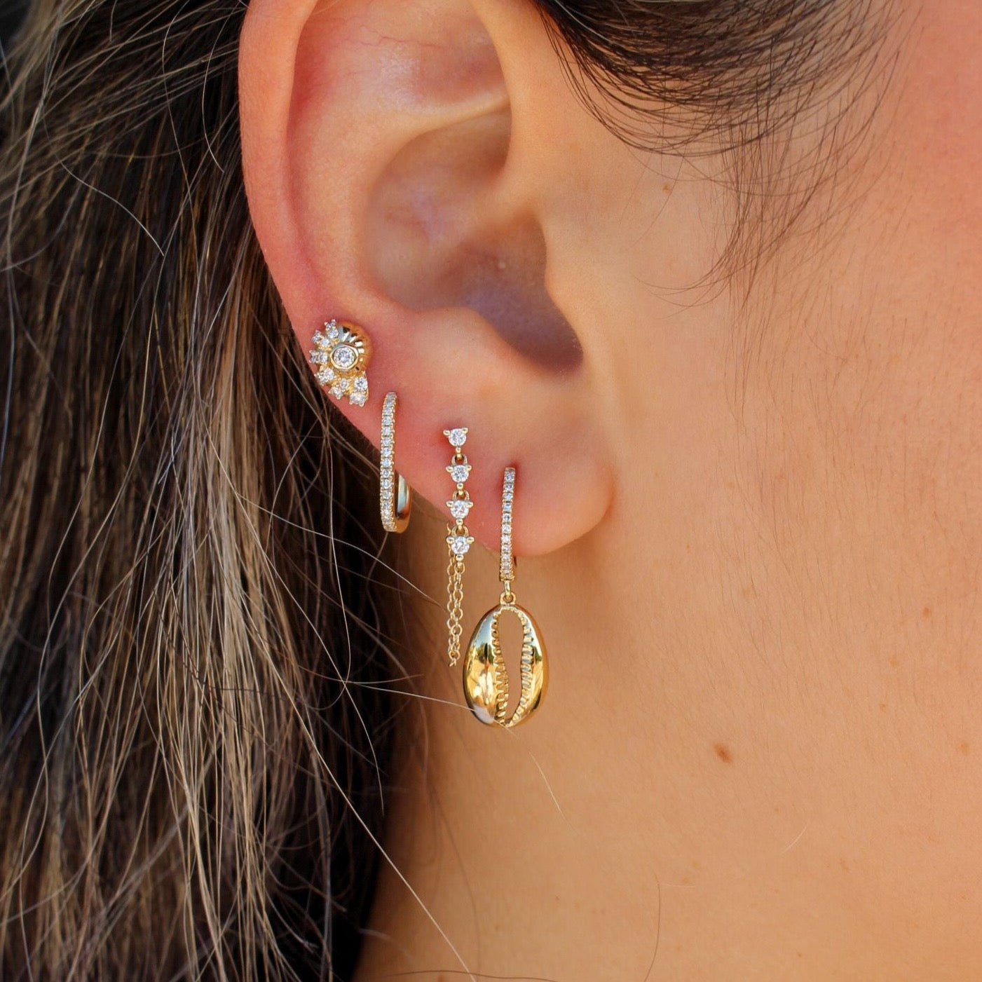 These Gold Diamond Shell Drop Hoop Earrings by Monisha Melwani combine elegance with a playful design. Featuring a delicate shell drop and sparkling diamond accents, these earrings are perfect for adding a touch of luxury to any outfit. Sold as a single, they can be paired with other earrings for a trendy layered look.