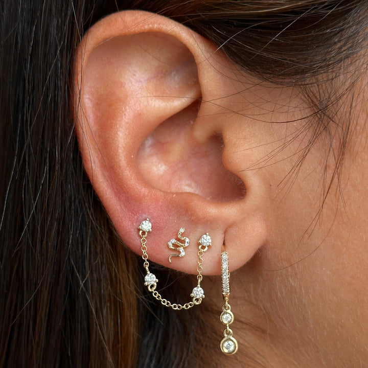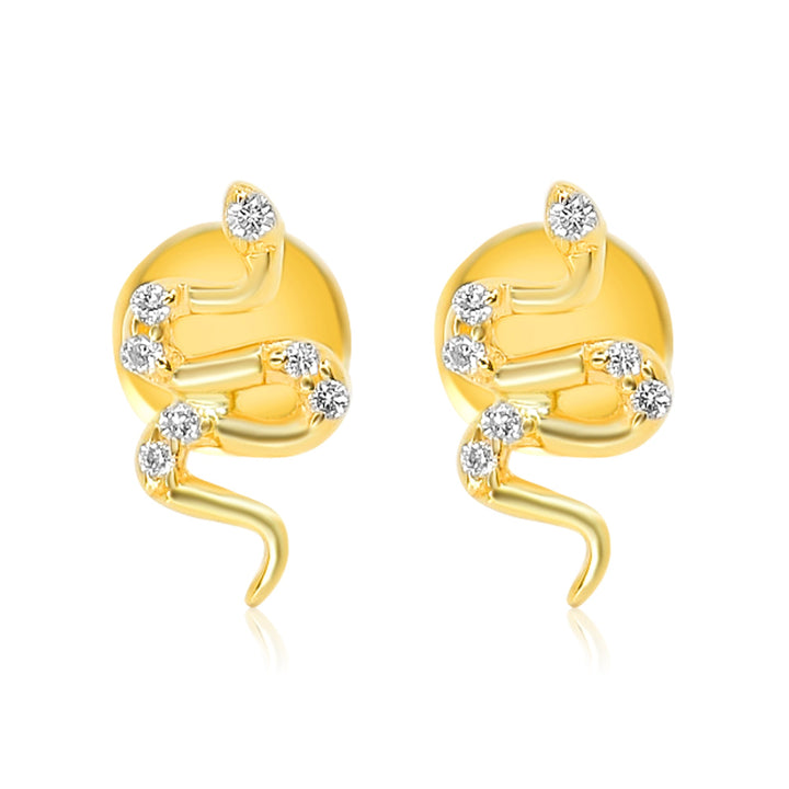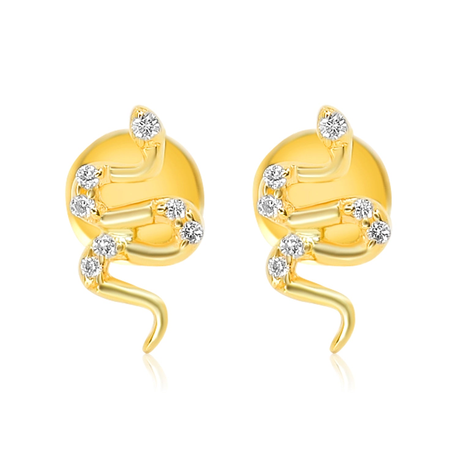 These Gold Diamond Snake Stud Earrings by Monisha Melwani are a chic and stylish accessory. Featuring a charming snake design, these earrings are adorned with sparkling diamonds, making them a unique addition to any jewelry collection. Sold as a single, they can be paired with other earrings for a trendy layered look.