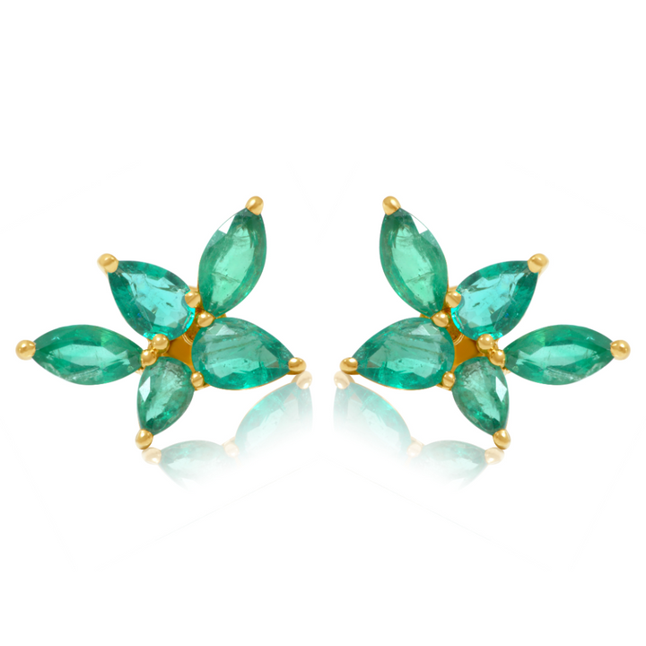 This Gold Emerald Flower Earring Stud by Monisha Melwani features exquisite emeralds set in 14K yellow gold. Sold as a single earring, it measures 15x11 mm and showcases a total of 2.59 carats of emeralds, weighing 2.36 grams. This piece adds a charming floral touch to any jewelry collection.
