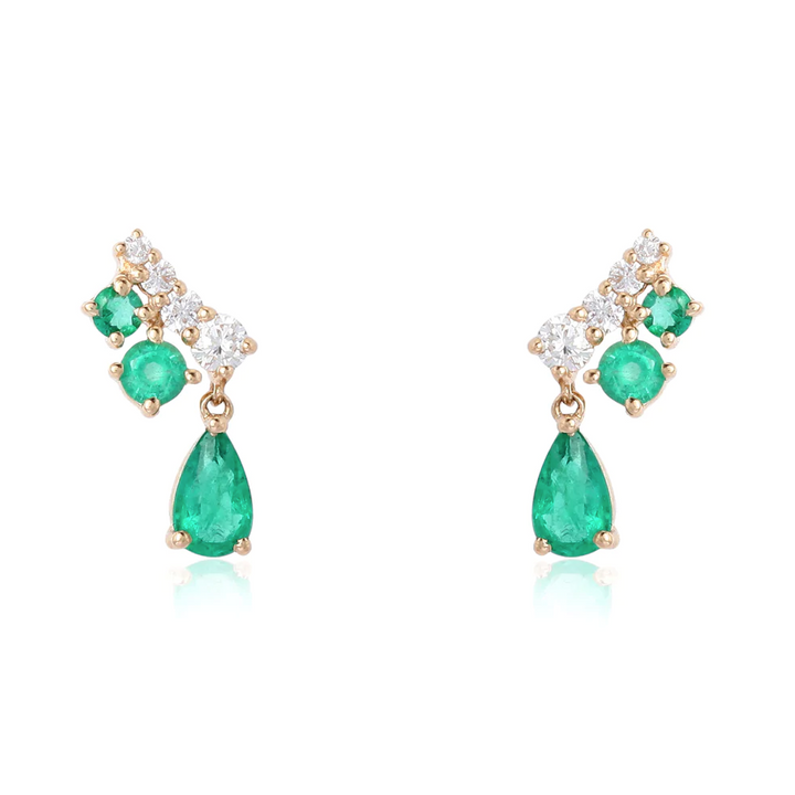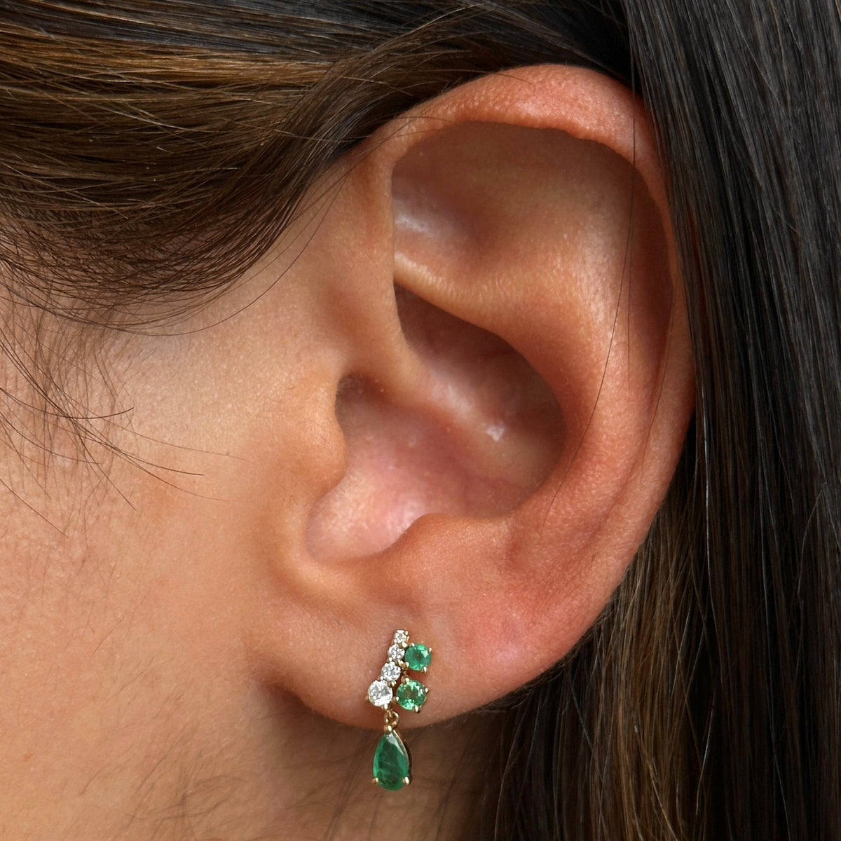 The Gold Emerald Pear and Diamond Bar Earring by Monisha Melwani features a stunning combination of diamonds and emeralds set in 14KT yellow gold. Sold as a single earring, it showcases 0.15 carats of diamonds and 0.62 carats of blue sapphires, making it a perfect choice for those who appreciate elegant jewelry. Available for preorder.