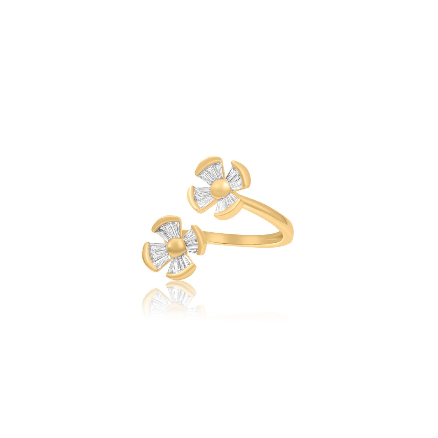 The Gold Flower Baguette Diamond Ring by Monisha Melwani features stunning diamonds set in 18K yellow gold. Measuring size 6.5 and weighing 3.277 grams, this ring showcases 0.415 carats of diamonds, perfect for those who appreciate elegance and floral designs.