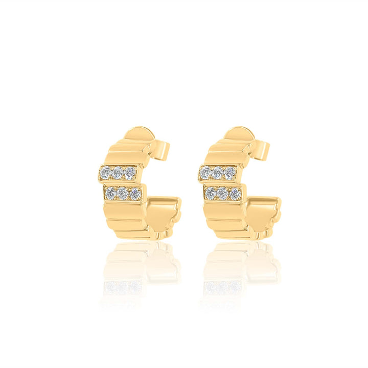 These Gold Fluted Diamond Hoop Earrings by Monisha Melwani feature exquisite diamonds set in 14K yellow gold. Sold as a pair, these earrings weigh 6.00 grams and showcase a fluted design that adds elegance to any look.