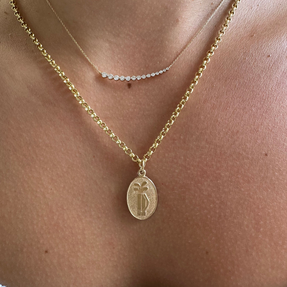 The Gold Golf Medallion Charm by Monisha Melwani is crafted in 14K yellow gold. Measuring 1 inch, this charm is perfect for golf enthusiasts looking to personalize their jewelry collection with a touch of elegance.