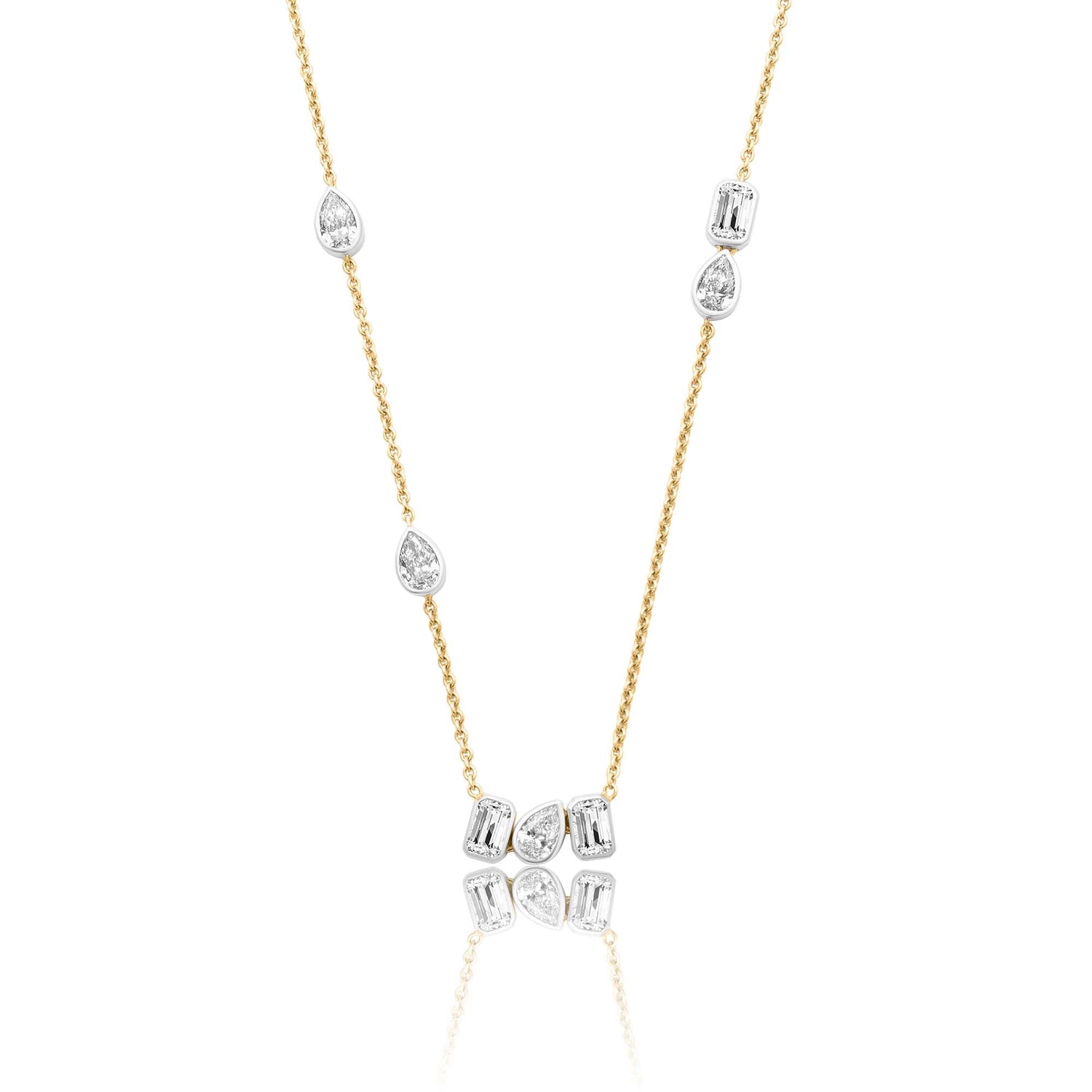 Crafted in 14K yellow gold with diamonds: emerald (0.59cts) and pear (0.59cts). Gold weight: 4.14 grams. Measures 14 inches with a 2-inch extension.