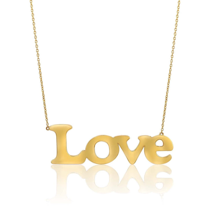 The Gold Large Love Necklace by Monisha Melwani features the word 'Love' in a bold, elegant script crafted from solid 14KT yellow gold. Measuring between 16 to 18 inches, this necklace is a striking expression of sentiment, making it perfect for both everyday wear and special occasions.