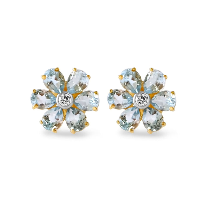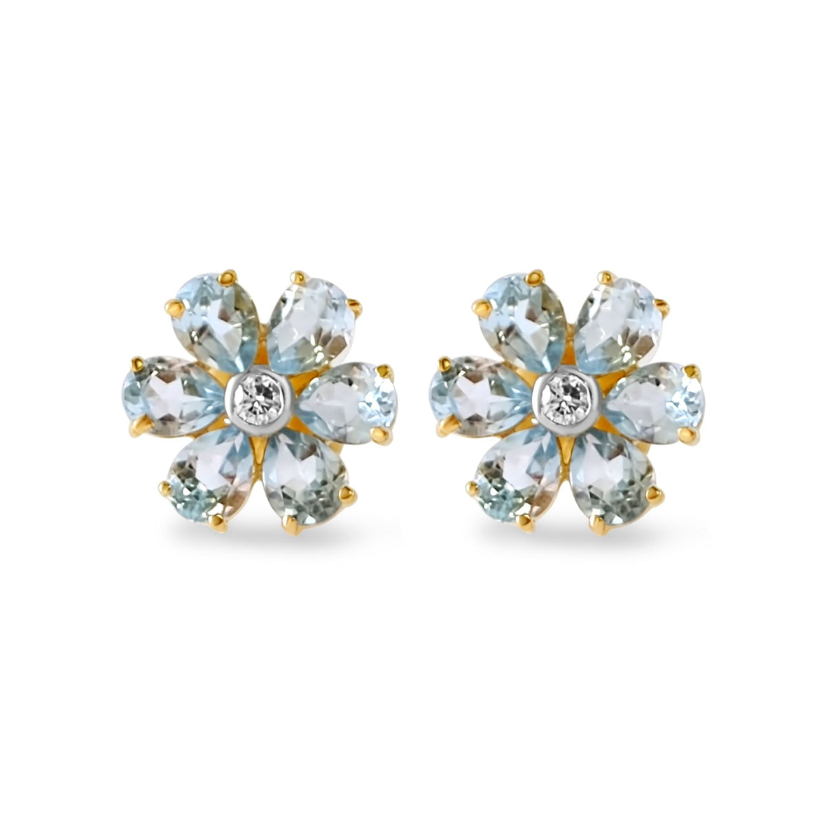 Made from high-quality 14KT Yellow Gold, these earrings incorporate light blue topaz and diamonds, with the gold weight at 1.80 grams. The floral design adds a touch of elegance, and they are beautifully presented for gifting or personal wear.