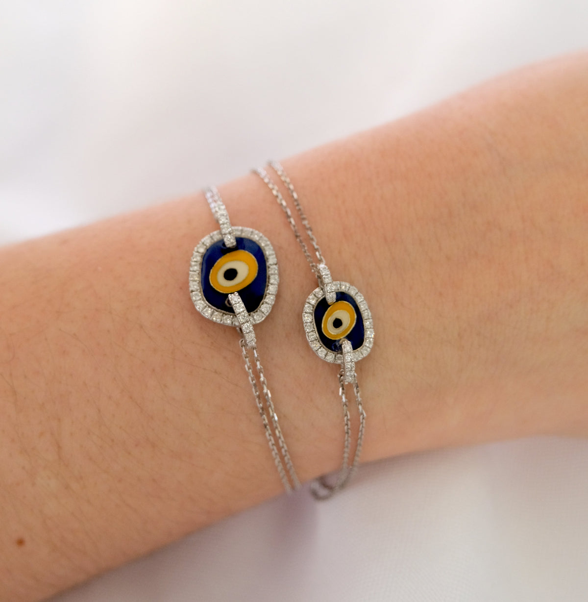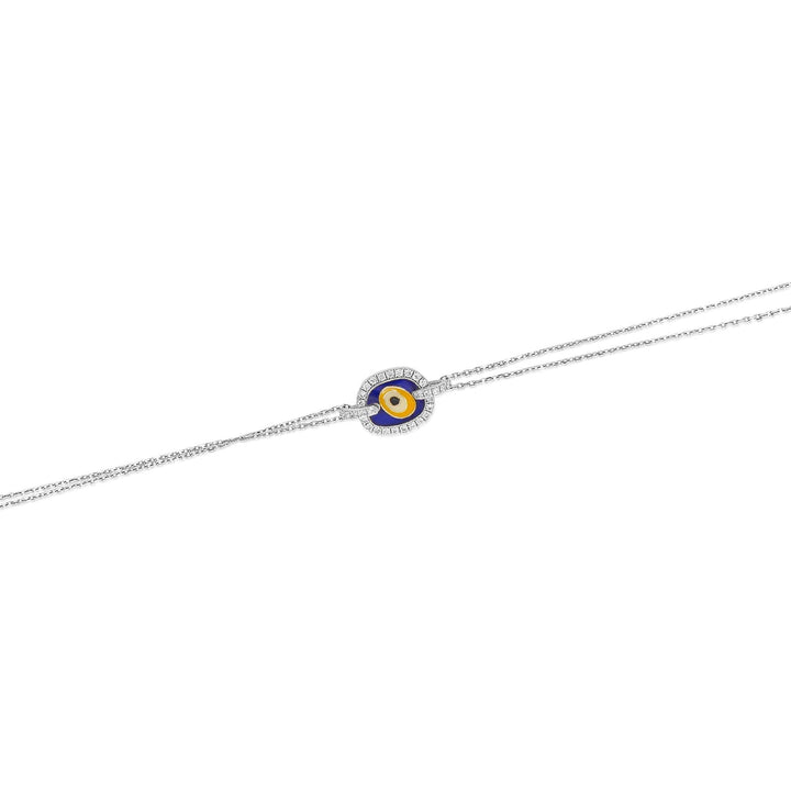 Crafted in 14k yellow gold, adorned with blue, yellow, white, and black enamel, along with diamonds. Adjustable length of 5-7 inches for a customizable fit.