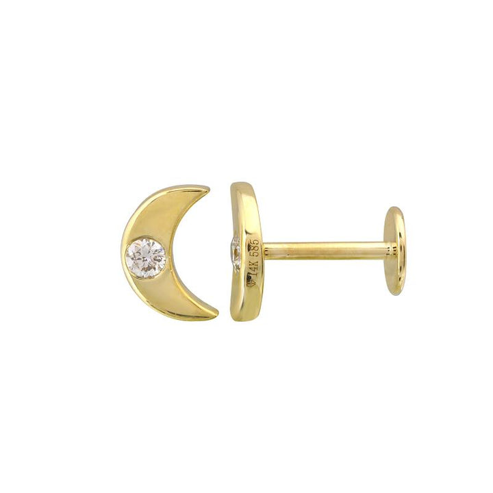 This Gold Moon Diamond Flat Back Earring by Monisha Melwani features a beautiful moon design adorned with diamonds set in 14k yellow gold. With a total diamond weight of 0.6cts and a weight of 0.84 grams, this earring is sold as a single and has a post length of 6.5mm, making it a stunning accessory for any occasion.