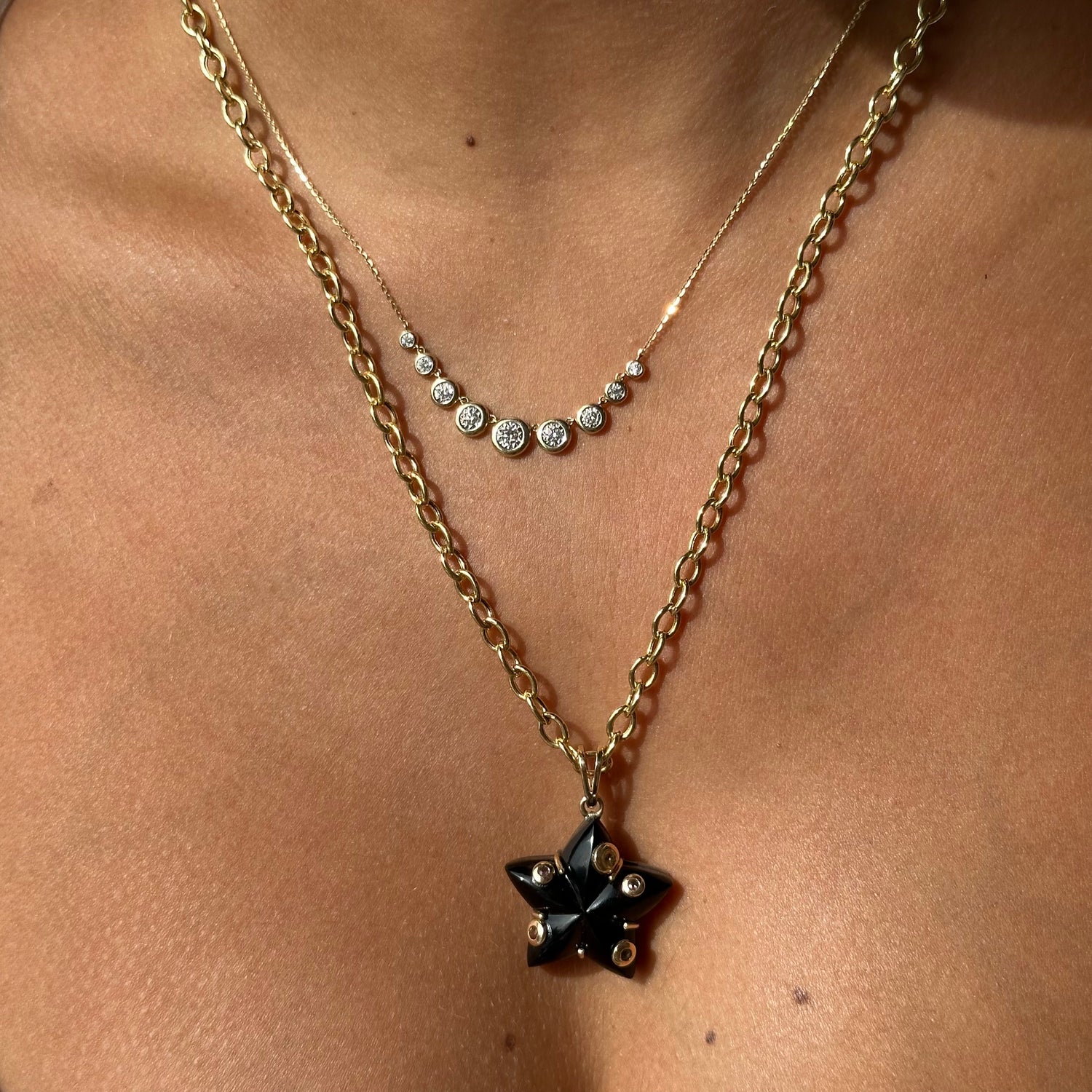 This Gold Multi Sapphire Black Onyx Star Pendant by Monisha Melwani features stunning sapphires set in 14k yellow gold. Measuring 1 inch, this pendant adds a celestial touch to your jewelry collection, making it a perfect accessory for any occasion.