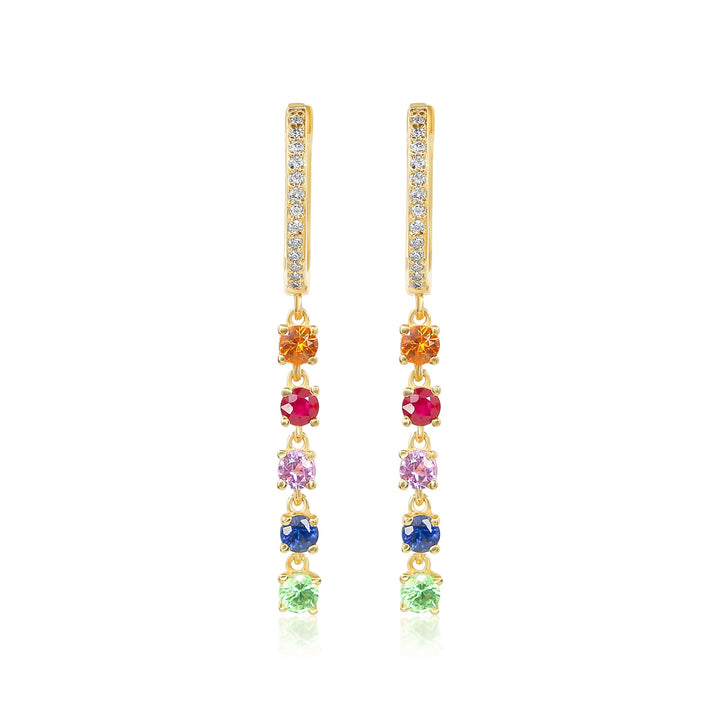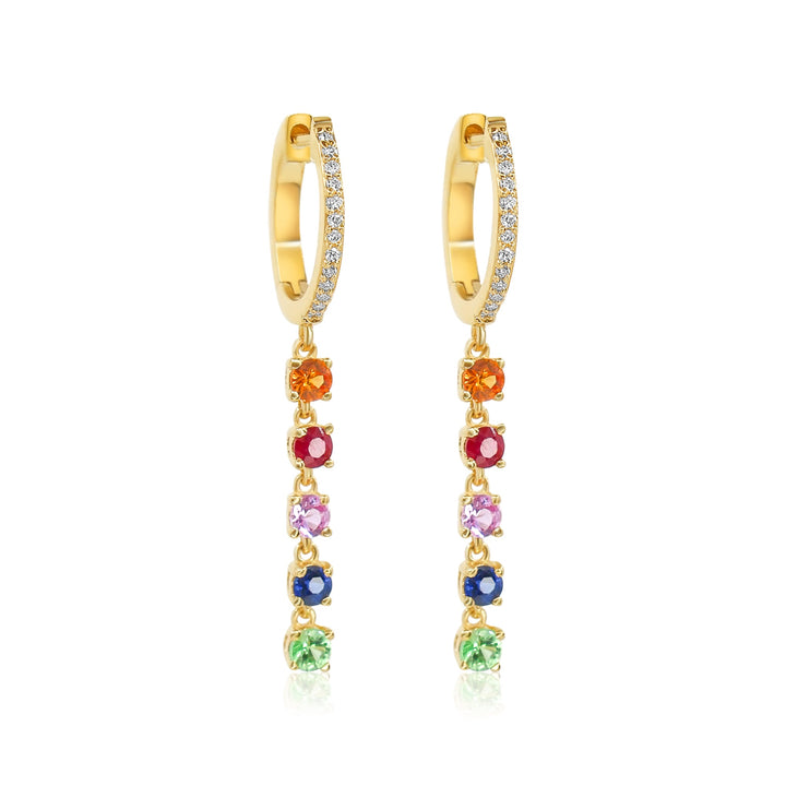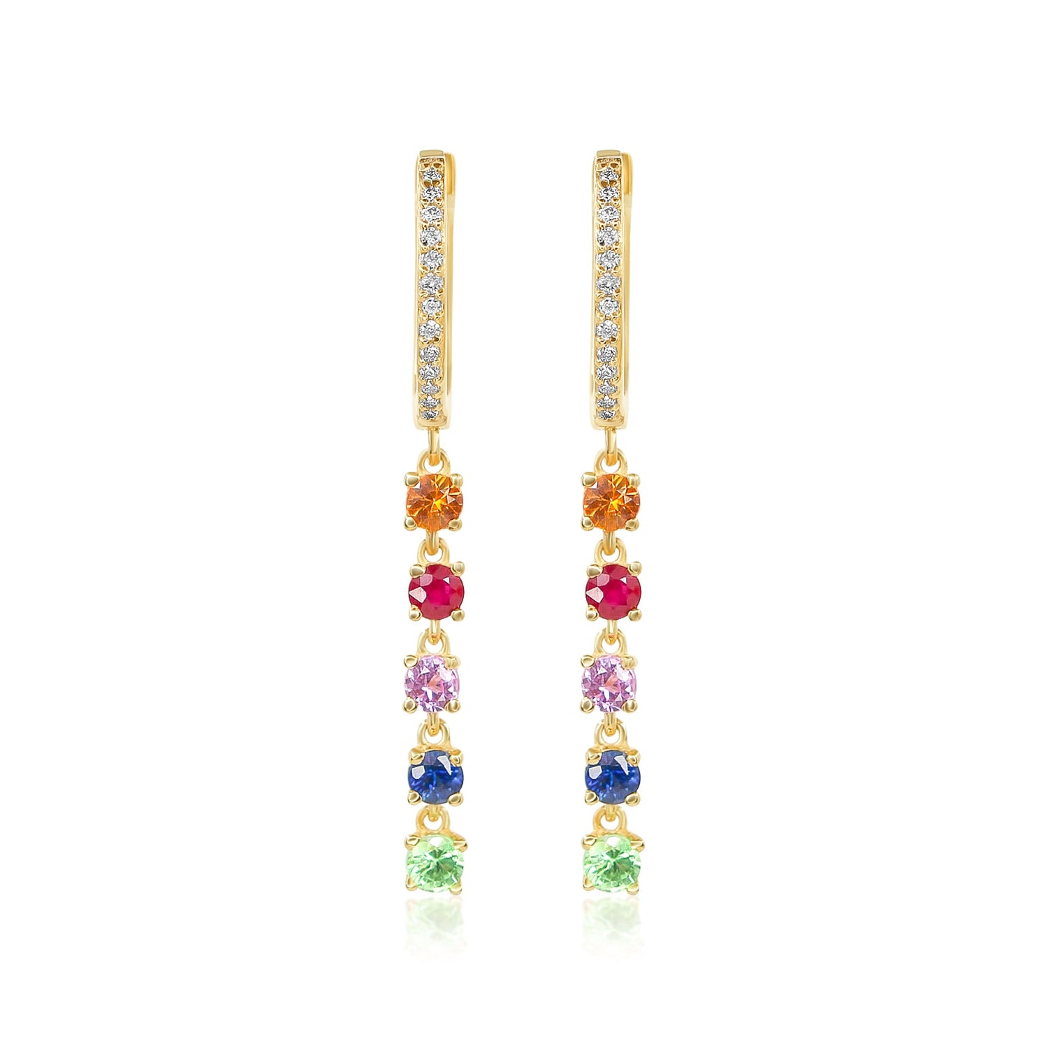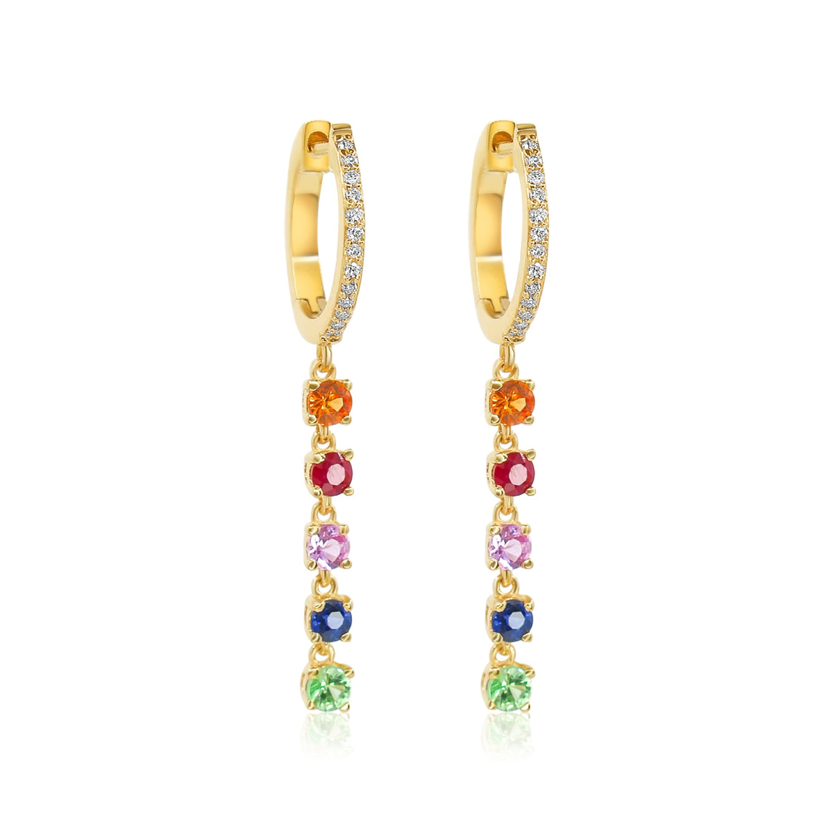 These Gold Multi Sapphire Drop Hoop Earrings by Monisha Melwani feature a beautiful combination of diamonds and multi sapphires set in 14k yellow gold. Sold as a pair, the hoops measure 10mm, with diamonds totaling 0.06cts and multi sapphires at 0.72cts, making them a chic addition to any jewelry collection.