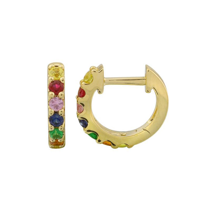 These Gold Multi Sapphire Hoop Earrings by Monisha Melwani feature an array of multi-colored sapphires set in 14k yellow gold. Measuring 12mm and sold as a single, these earrings offer a playful yet elegant look, perfect for any occasion.