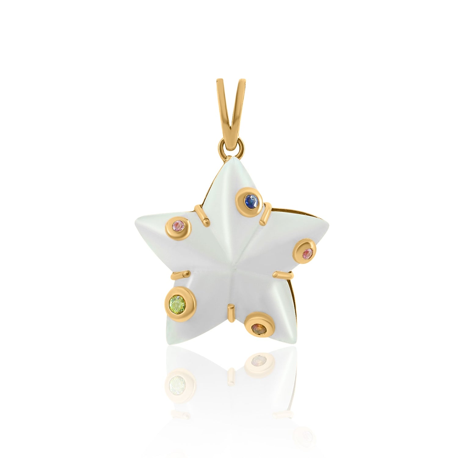 This Gold Multi Sapphire Moonstone Star Pendant by Monisha Melwani features sapphires set in 14k yellow gold. Measuring 1 inch, this pendant adds a touch of celestial elegance to any outfit, making it a wonderful accessory for both casual and formal occasions.
