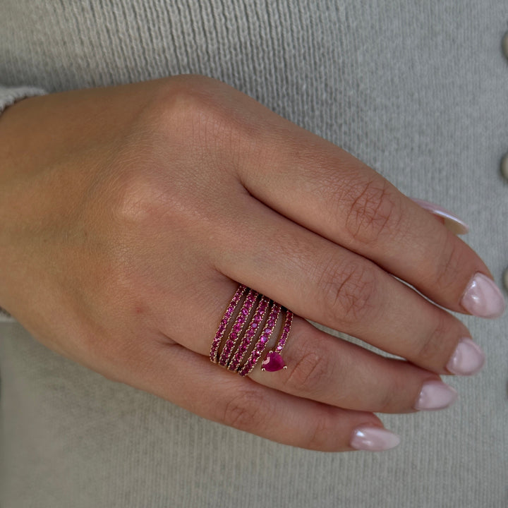 This Gold Multi Wrap Heart Ruby Ring by Monisha Melwani features a stunning design with vibrant rubies set in luxurious 18k rose gold. Weighing 7.86 grams and with a total ruby weight of 2.40cts, this ring showcases a heart-shaped ruby centerpiece that symbolizes love and passion. The innovative multi-wrap design creates an elegant embrace around the finger, making it a perfect expression of romance and sophistication.