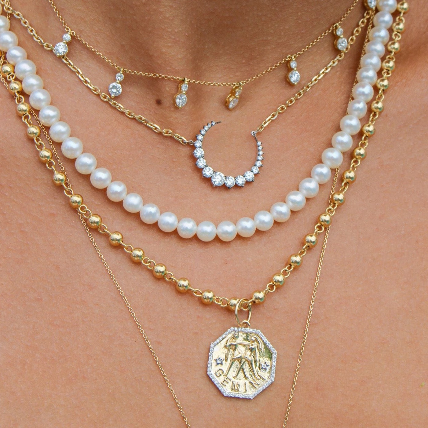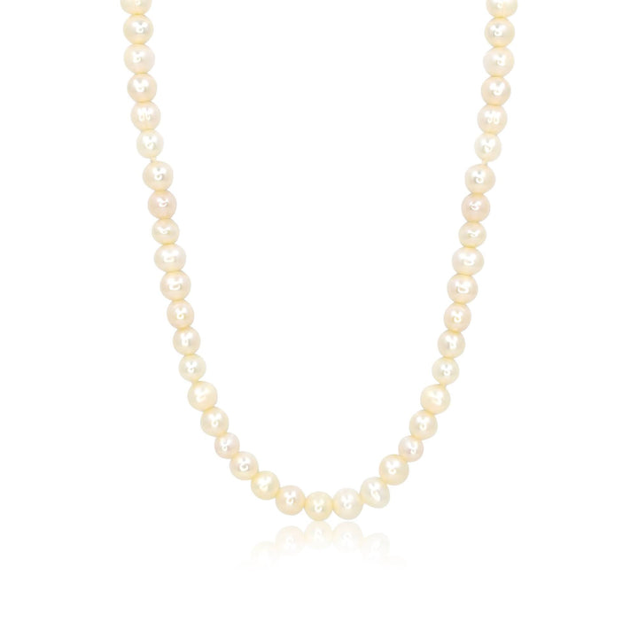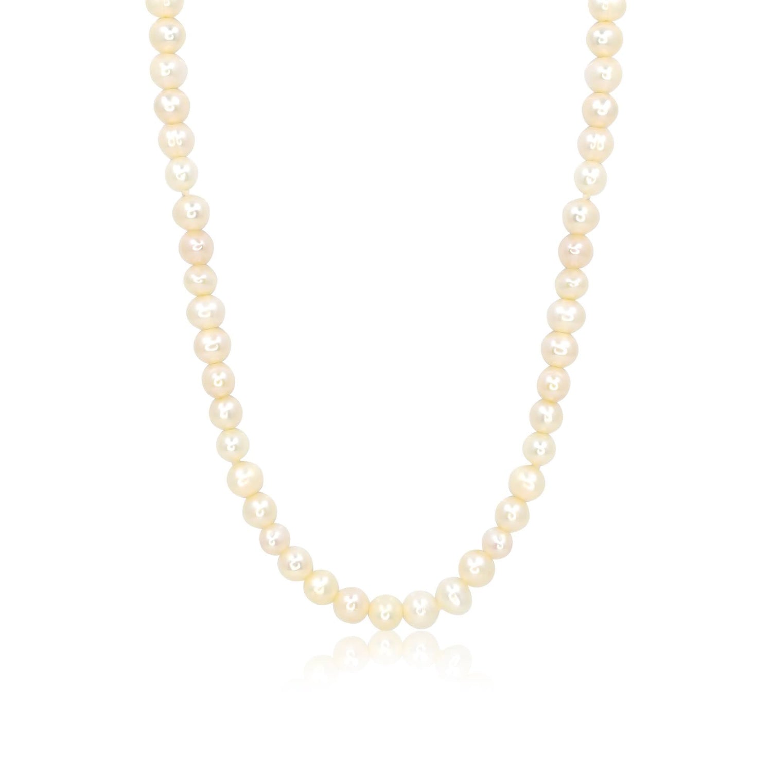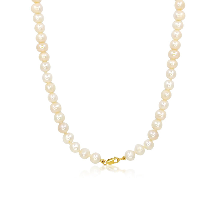 This Gold Pearl Necklace by Monisha Melwani features an exquisite arrangement of freshwater pearls, complemented by a secure 14k gold clasp. The necklace embodies timeless elegance, making it a versatile piece that can be worn for any occasion. Its availability in multiple sizes ensures a perfect fit for everyone, and the 5mm pearls exude sophistication and charm.