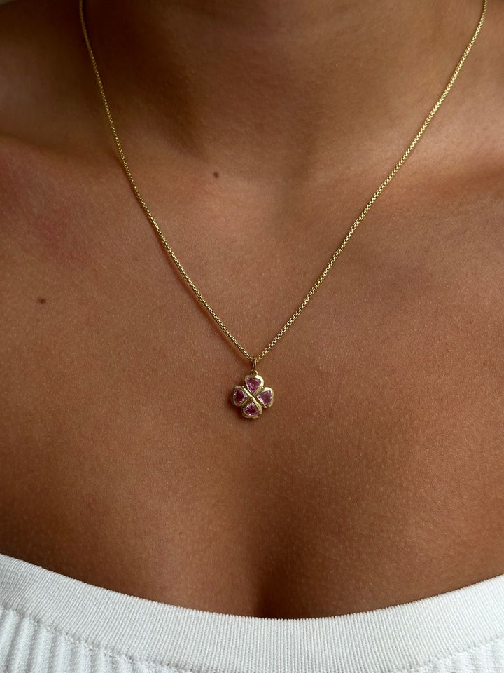 This Gold Pink Sapphire Clover Charm by Monisha Melwani features a delightful clover design, symbolizing luck and prosperity, adorned with vibrant pink sapphires set in polished 14k yellow gold. The charm embodies a blend of whimsy and elegance, making it perfect for those who appreciate playful designs with a luxurious touch. Its 12mm size adds a pop of color and meaning to any jewelry collection, whether worn on a necklace or charm bracelet. Elegantly packaged in a Monisha Melwani Jewelry box, it makes an ideal gift or personal keepsake.