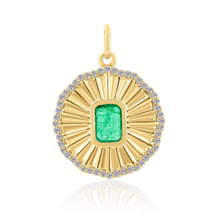 This Gold Round Diamond Emerald Fluted Pendant by Monisha Melwani features radiant diamonds and emeralds set in 14k yellow gold. Measuring 26mm, this elegant pendant showcases a luxurious design that adds sophistication to any jewelry collection. Its beautiful combination of gemstones makes it perfect for special occasions.