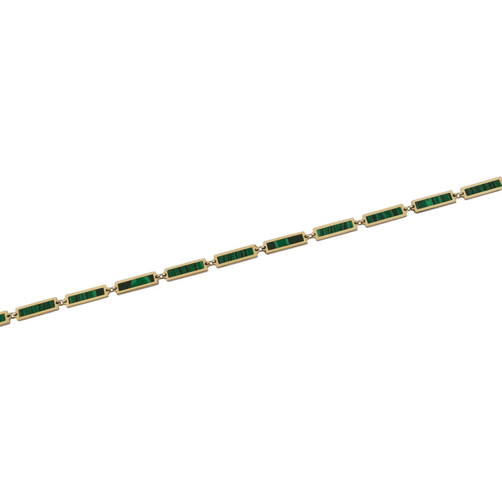 Crafted in 14K yellow gold, weighing 2.8 grams. Features a malachite stone, emphasizing its distinctive color and design. Measures 7 inches for a comfortable fit.