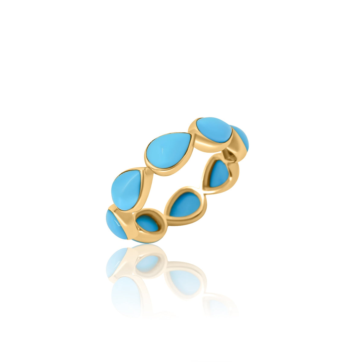 This Gold Tear Drop Turquoise Eternity Ring by Monisha Melwani features vibrant turquoise set in luxurious 14K yellow gold. With a size of 7, this ring showcases a beautiful teardrop design, making it a unique and colorful addition to any jewelry collection. Perfect for those who appreciate the beauty of gemstones, this ring is both striking and elegant.