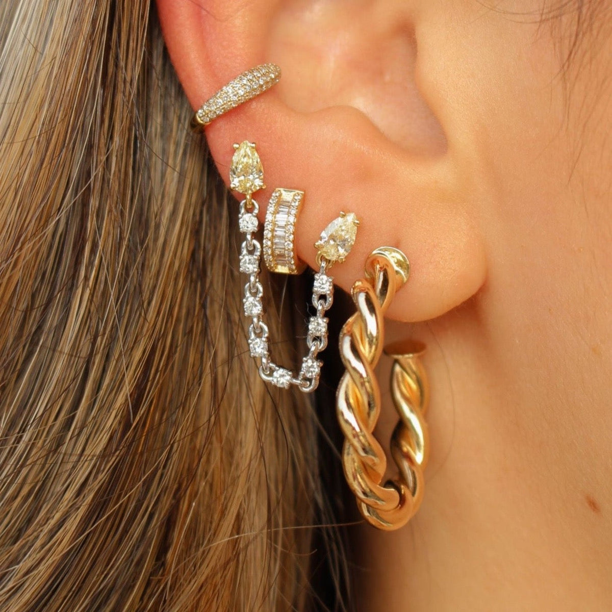 Crafted from premium 18K yellow gold, weighing 5.88 grams. Features 0.50 cts of white diamonds and 1.22 cts of yellow diamonds, designed for a chic and sophisticated look. Sold as a single earring for versatile styling options.