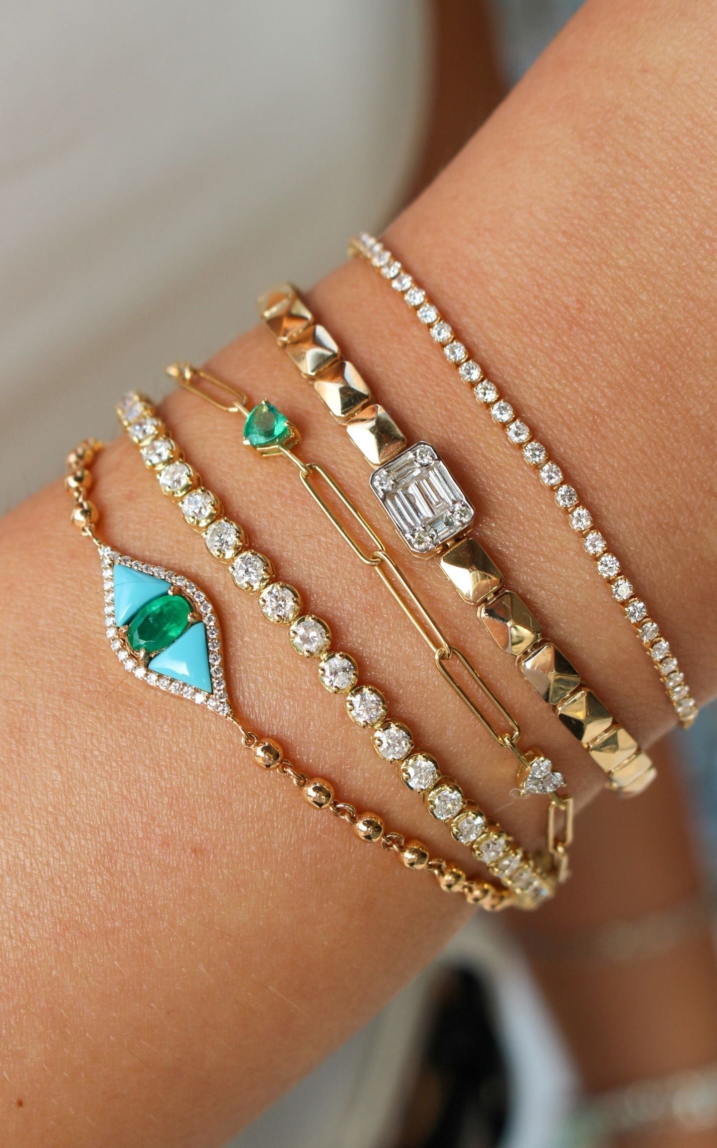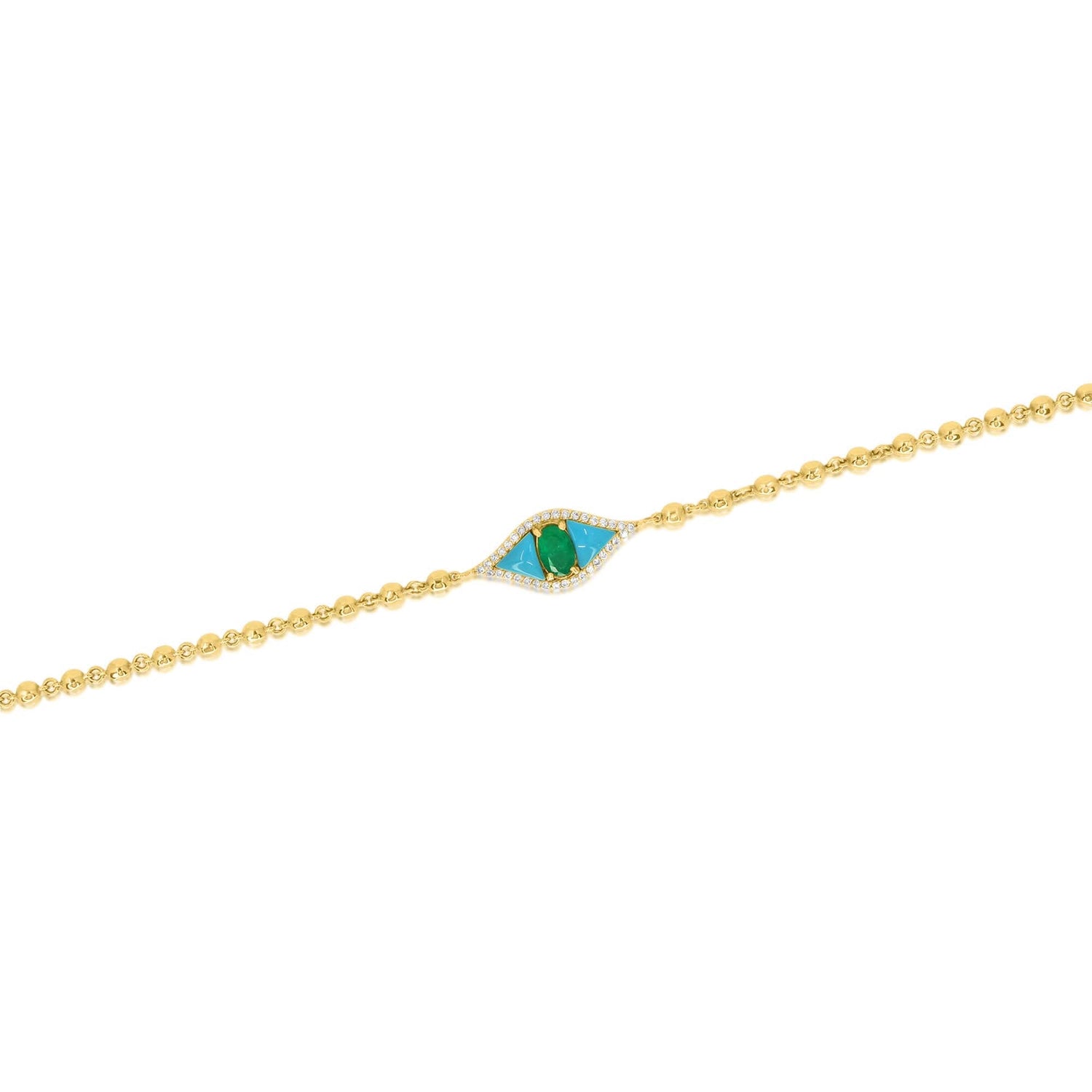 The Turquoise and Emerald Pave Dainty Eye Bracelet by Monisha Melwani features a striking design with turquoise enamel and emerald diamonds set in 14K gold. This bracelet combines vibrant colors and sparkling accents, making it a stylish and playful addition to any jewelry collection.