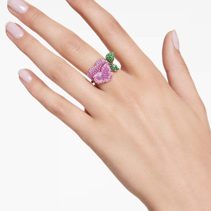 Daniel Swarovski's desire to create a diamond for everyone led to the founding of Swarovski in 1895. Inventing a machine that cut crystals more accurately than ever before, the precision-cut facets of Swarovski crystals allowed for exceptional clarity and brilliance. With a heritage spanning over 125 years, Swarovski remains a global leader in the jewelry industry, renowned for its craftsmanship, innovation, and elegance.Style notes: Inspired by the Flowers of Wonderland who live near the White Rabbits house, this brightly colored motif ring is wondrously fantastical. The rhodium-plated design is adorned with crystals of varying pink tones, as well as two dazzling leaves in verdant green. Wear it on its own or pair it with the flower earrings from the Alice in Wonderland family.Price: Please note price may vary due to exchange rate differences or shipping, duties and taxes. Price may also vary with materials choice. Final price is calculated at checkout at the designers website. Materials: Rhodium plated with crystals