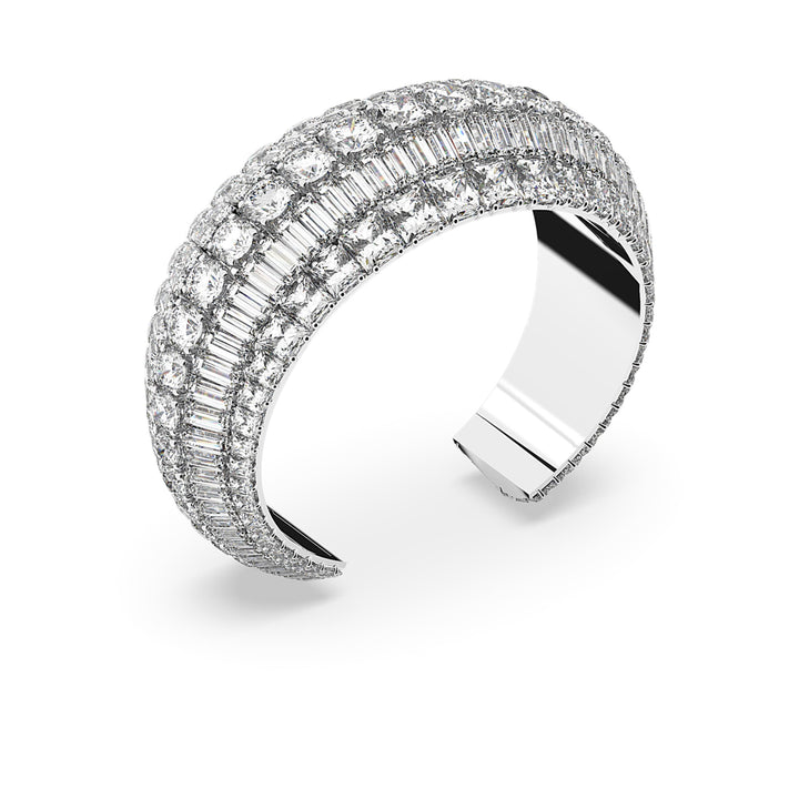 This Hyperbola Cuff Mixed Cuts White Rhodium Plated by Swarovski is a dramatic piece of modern craftsmanship that makes an impressive, "mathemagical" statement. The cuff features rows of clear stones in a mix of contemporary cuts, meticulously prong-set in an incredibly intricate and sculptural formation. The open-ended rhodium-plated design offers a sleek, industrial-inspired look that can be worn alone over a sleeve or stacked for maximum impact. Symbolizing complexity and innovative design, this cuff is a testament to Swarovski’s technical savoir-faire. It is a luxurious accessory that adds an avant-garde edge to any sophisticated jewelry collection.