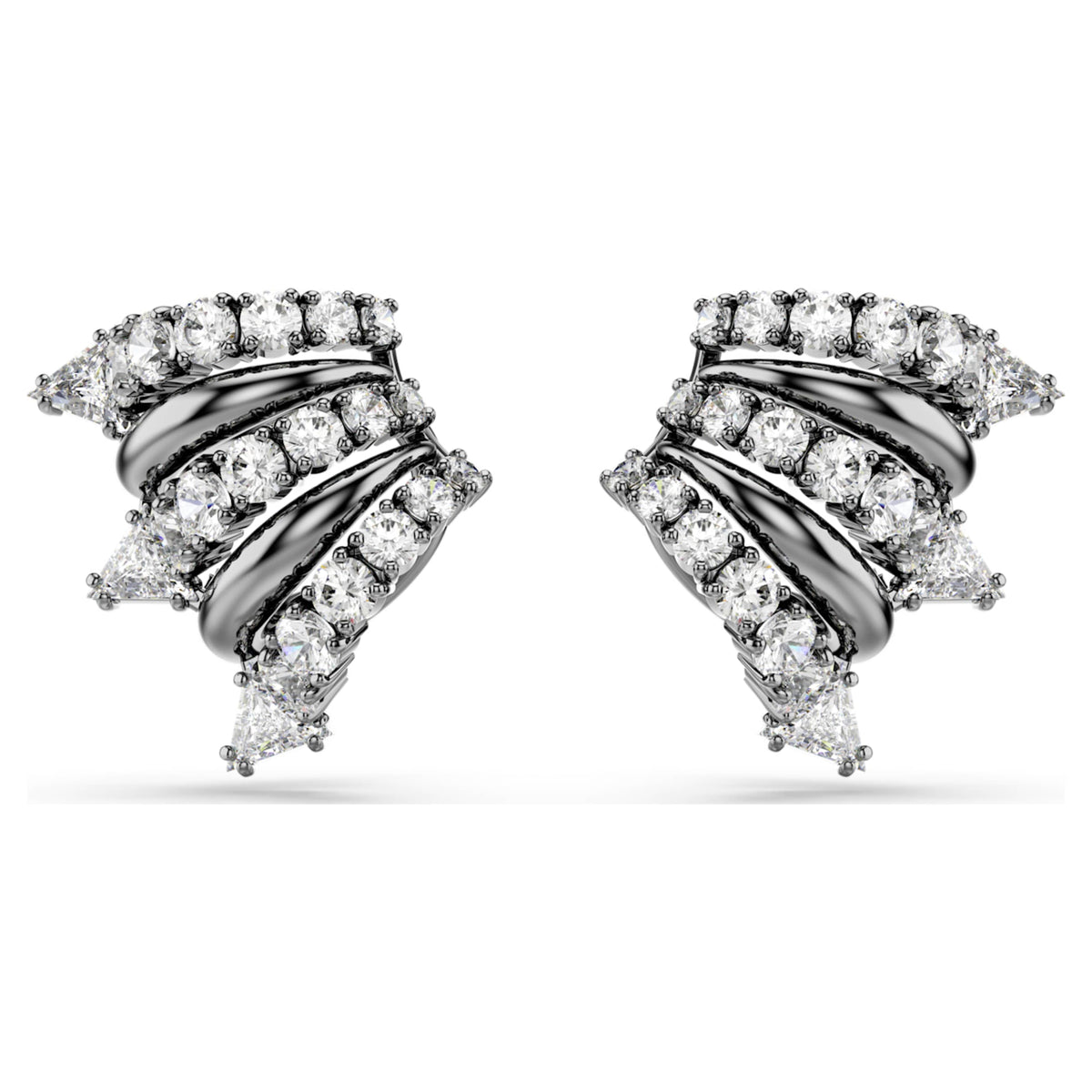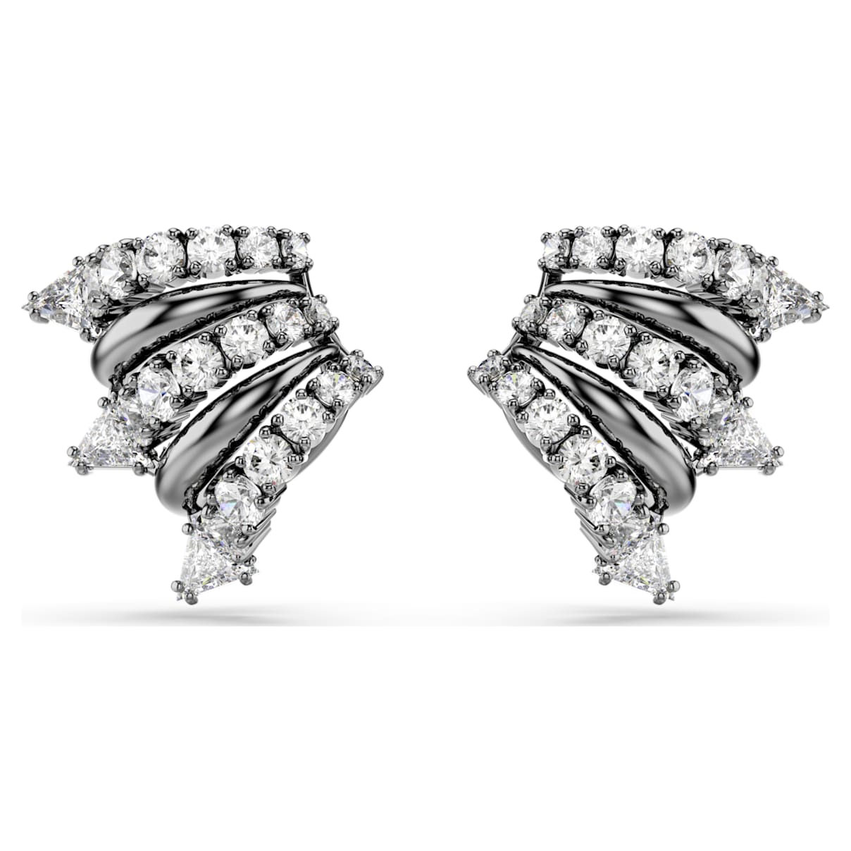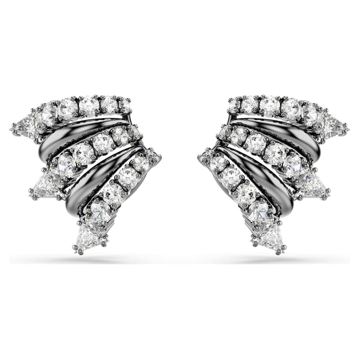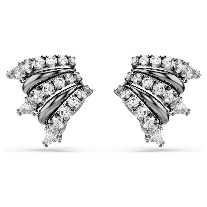 These Sublima Ear Cuffs White Rhodium Plated by Swarovski offer an eye-catching and modern take on traditional jewelry. Each cuff is crafted with dark ruthenium plating and features elegant metallic spirals alongside brilliant clear Swarovski Zirconia. The contemporary spiky tips add an edgy finish that symbolizes strength and creative individuality. These ear cuffs provide the look of multiple piercings with a comfortable and secure fit, making them an ideal choice for a sophisticated yet alternative style. Perfect for stacking alongside other studs or wearing as a standalone statement, they bring a touch of avant-garde luxury and crystalline light to any ensemble.
