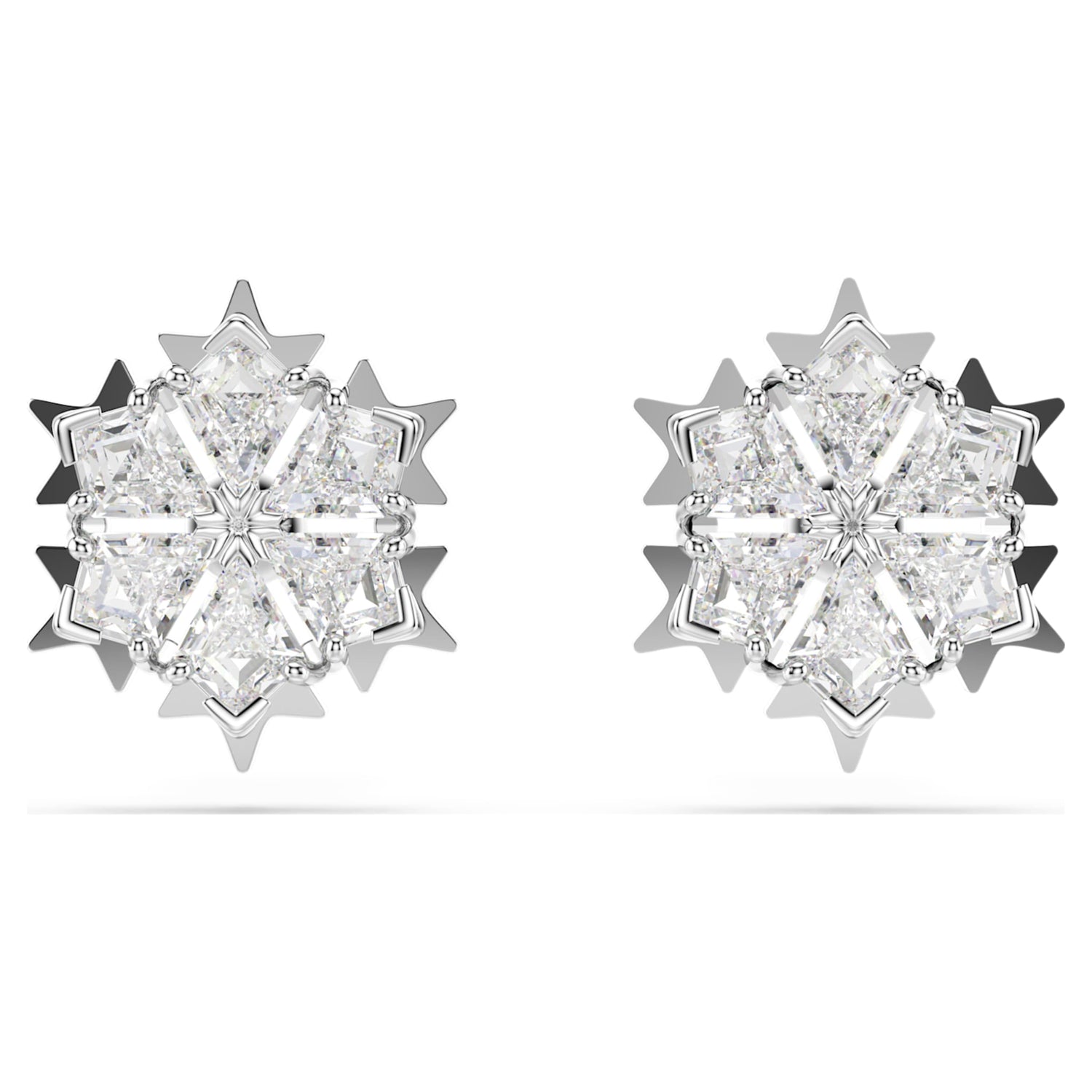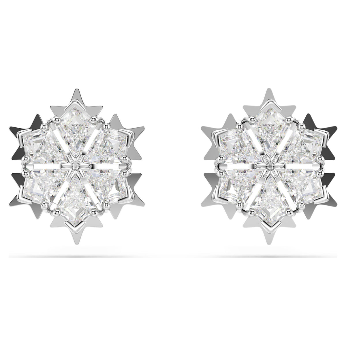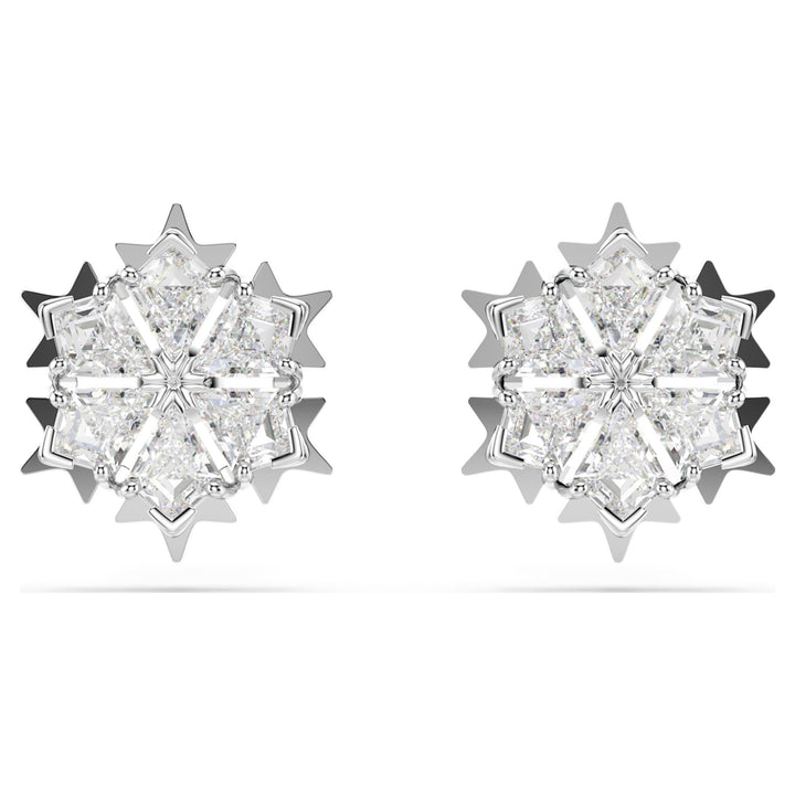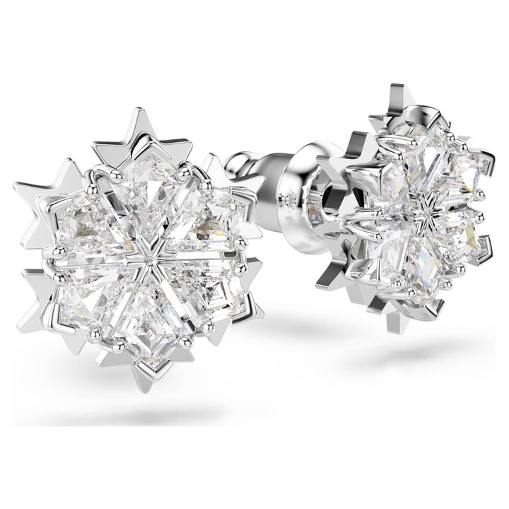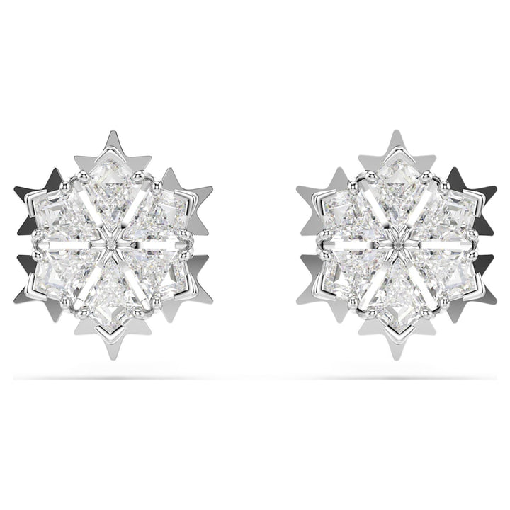 Crafted with rhodium plating, these pierced stud earrings feature a snowflake-inspired design set with clear Swarovski Zirconia.