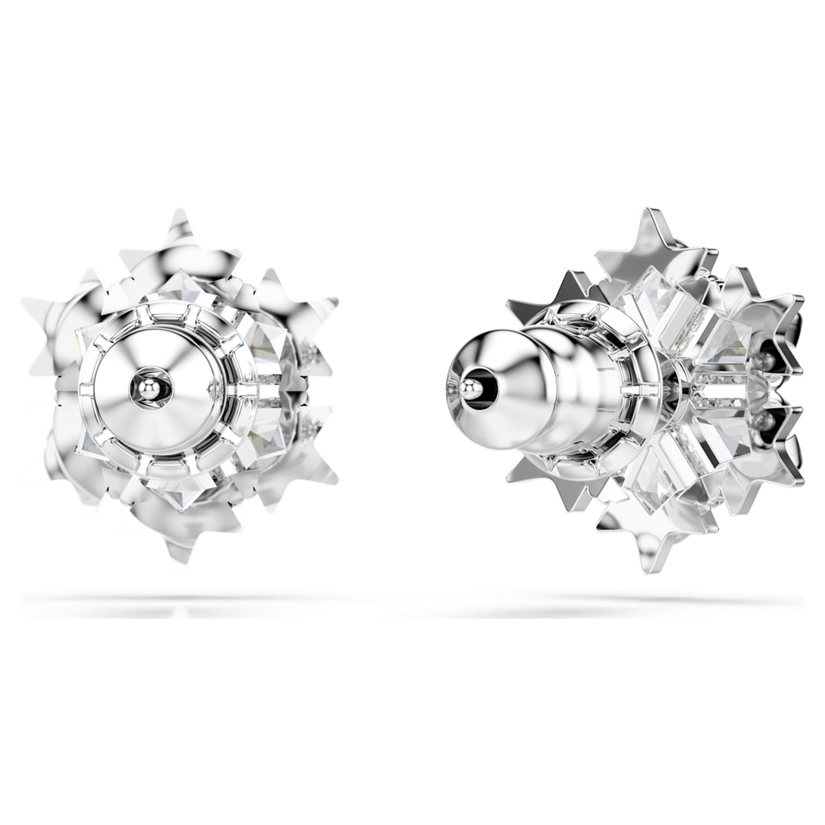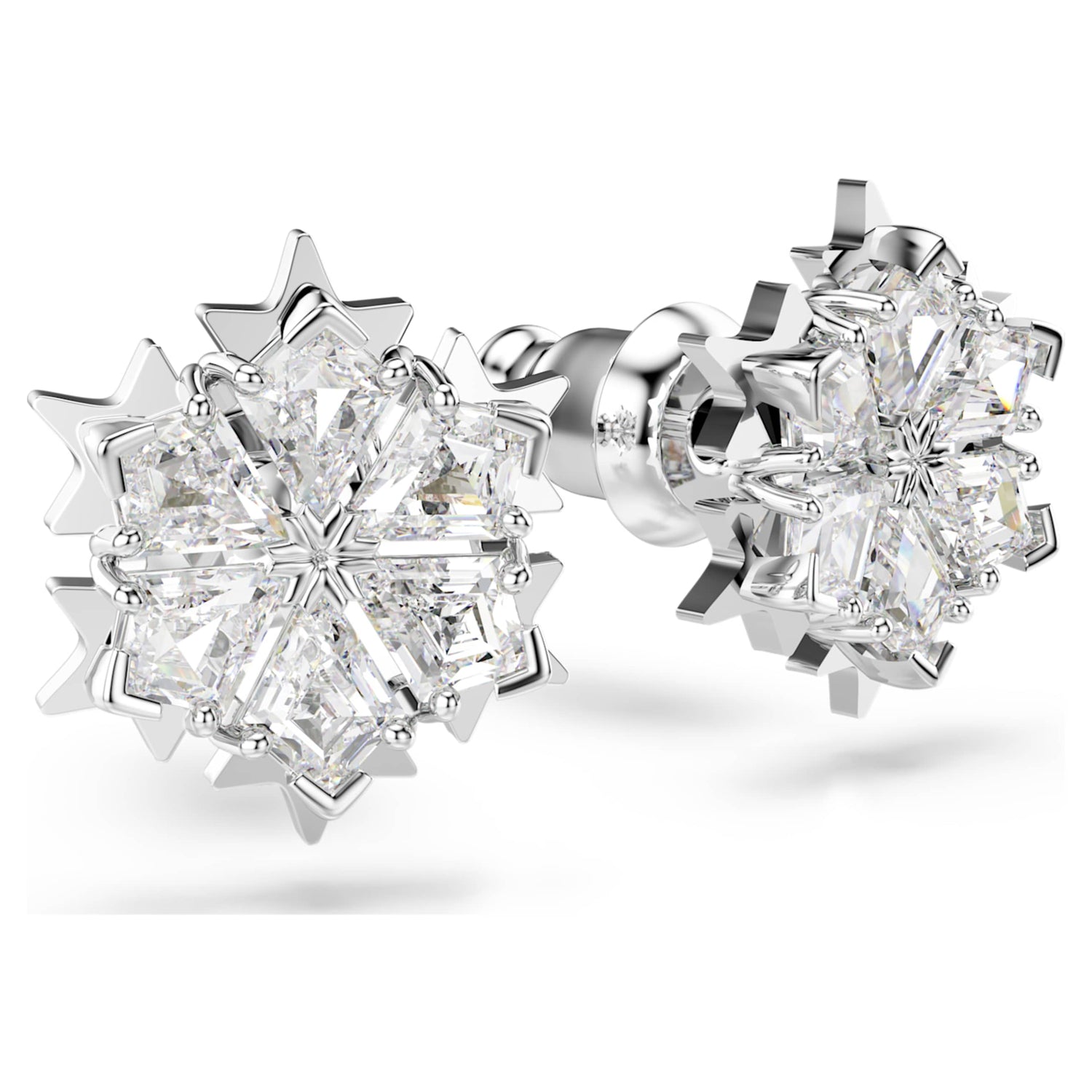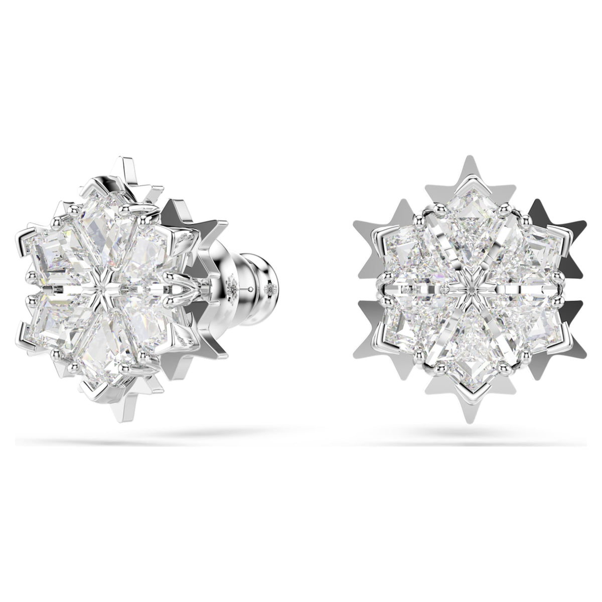 Crafted with rhodium plating, these pierced stud earrings feature a snowflake-inspired design set with clear Swarovski Zirconia.