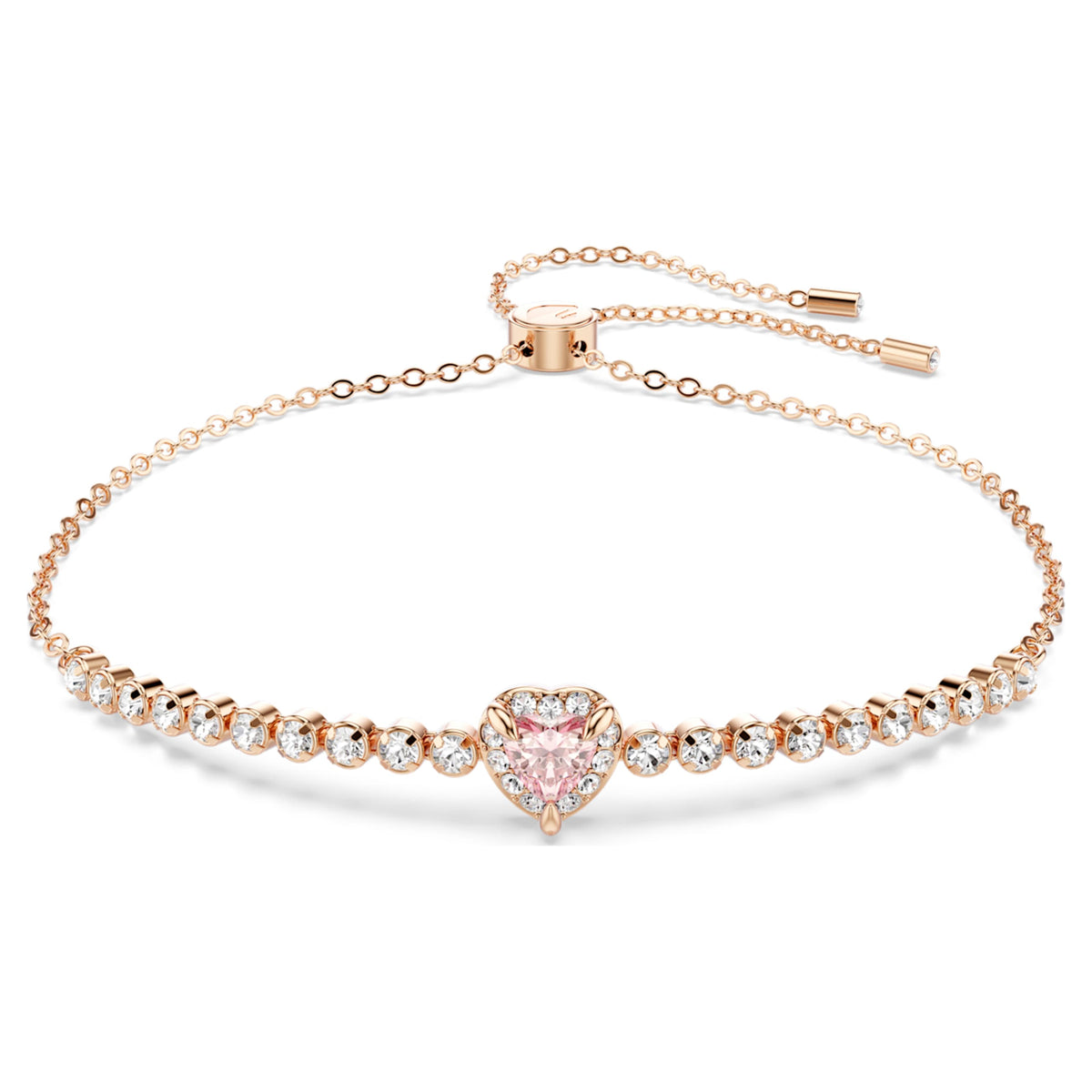 You can literally wear your heart on your sleeve with this elegant One bracelet, featuring a pink heart-shaped centerpiece. The rose gold-tone plated chain is formed from a row of clear crystals, leading to the vibrant focal point. This bracelet symbolizes a modern romance and a playful, feminine aesthetic. With an adjustable chain closure, it offers a "made-for-you" fit and a radiant pop of color that adds a touch of romantic glamour to any ensemble.