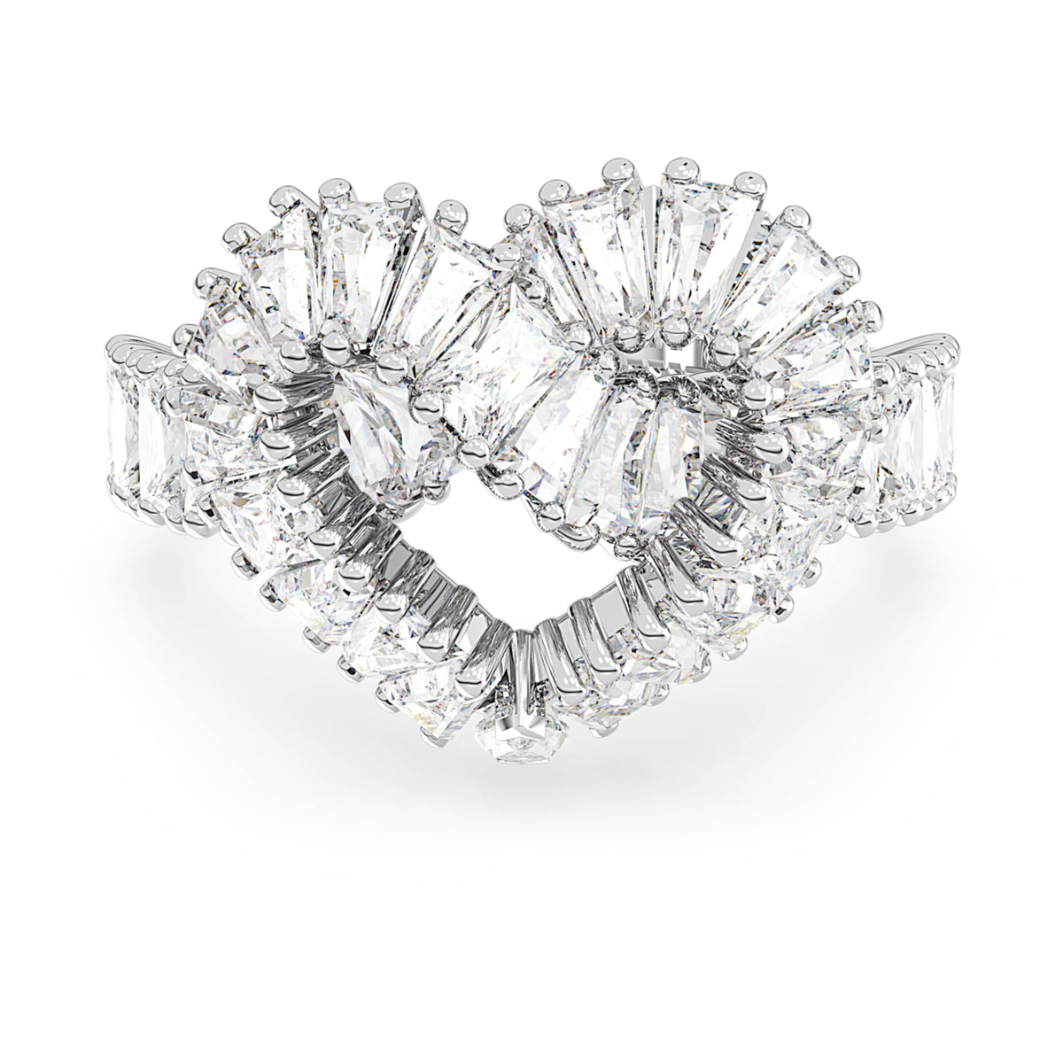 This Matrix Ring Mixed Cuts Heart White Rhodium Plated by Swarovski turns the classic heart into something architectural and boldly modern. A woven, heart-shaped silhouette is lit up with clear stones in a striking mix of cuts, creating depth, movement, and that unmistakable Swarovski brilliance from every angle. Equal parts romantic and statement-making, it feels expressive without being overly sweet. Wear it solo as a signature piece or pair it with sleek bands to build a layered look that celebrates love, self-confidence, and the joy of dressing up.