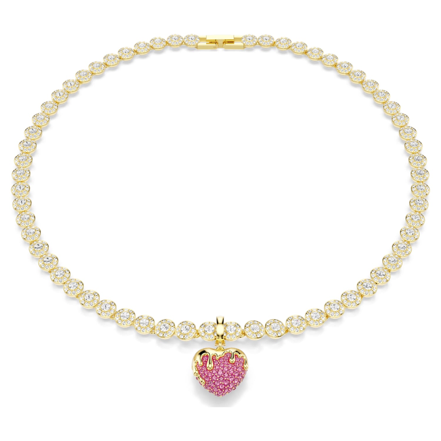 This gold-tone plated heart charm features a pink lacquered finish, clear crystals, and a custom-designed clasp.