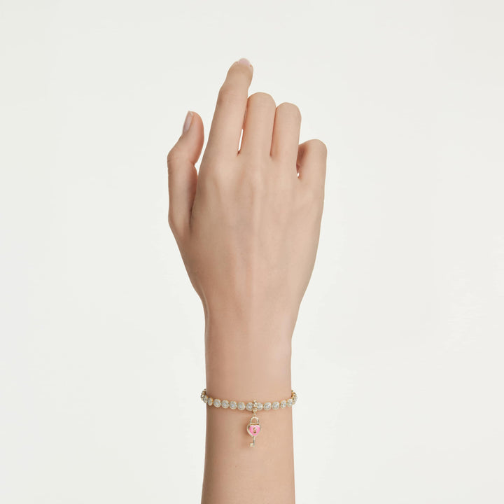 This Idyllia Charm by Swarovski is a romantic, locket-inspired accessory designed to add a touch of affection to your jewelry. The heart and key motif is gold-tone plated and features a central Swarovski Zirconia that radiates classic elegance. Symbolizing the beauty of a heart that has been unlocked, this charm is perfect for those with a sentimental spirit. It comes with a custom-designed clasp, allowing you to easily move it between different bracelets and necklaces. Whether gifted or kept, this charm is a timeless expression of love that adds a luxurious, personalized element to your style.