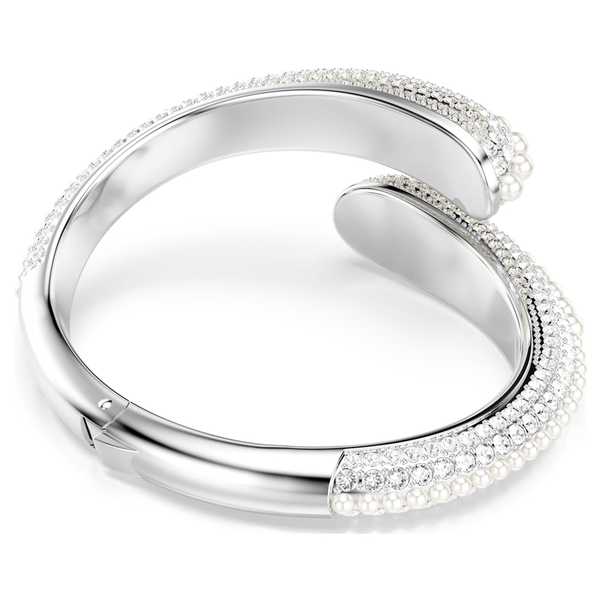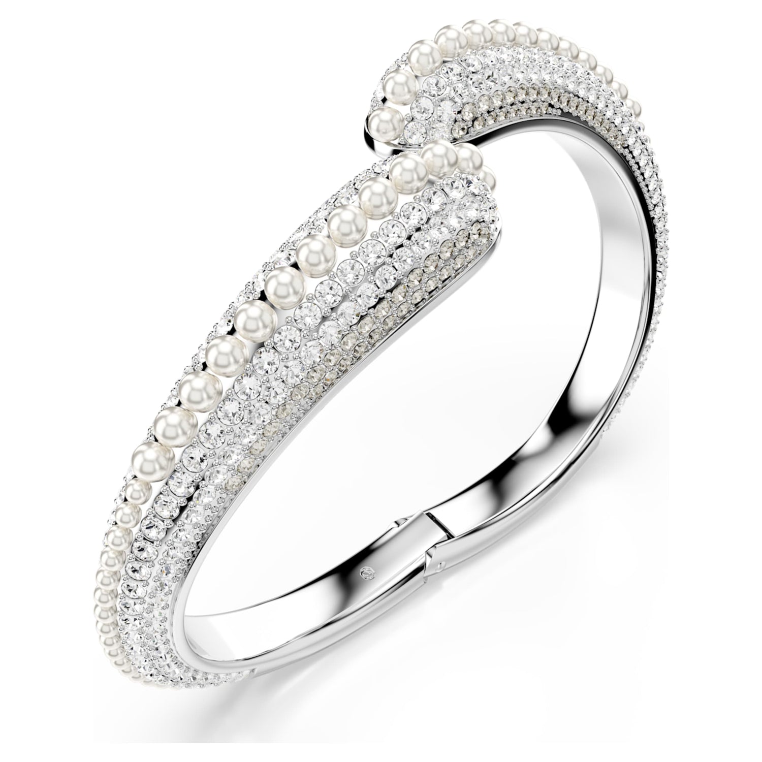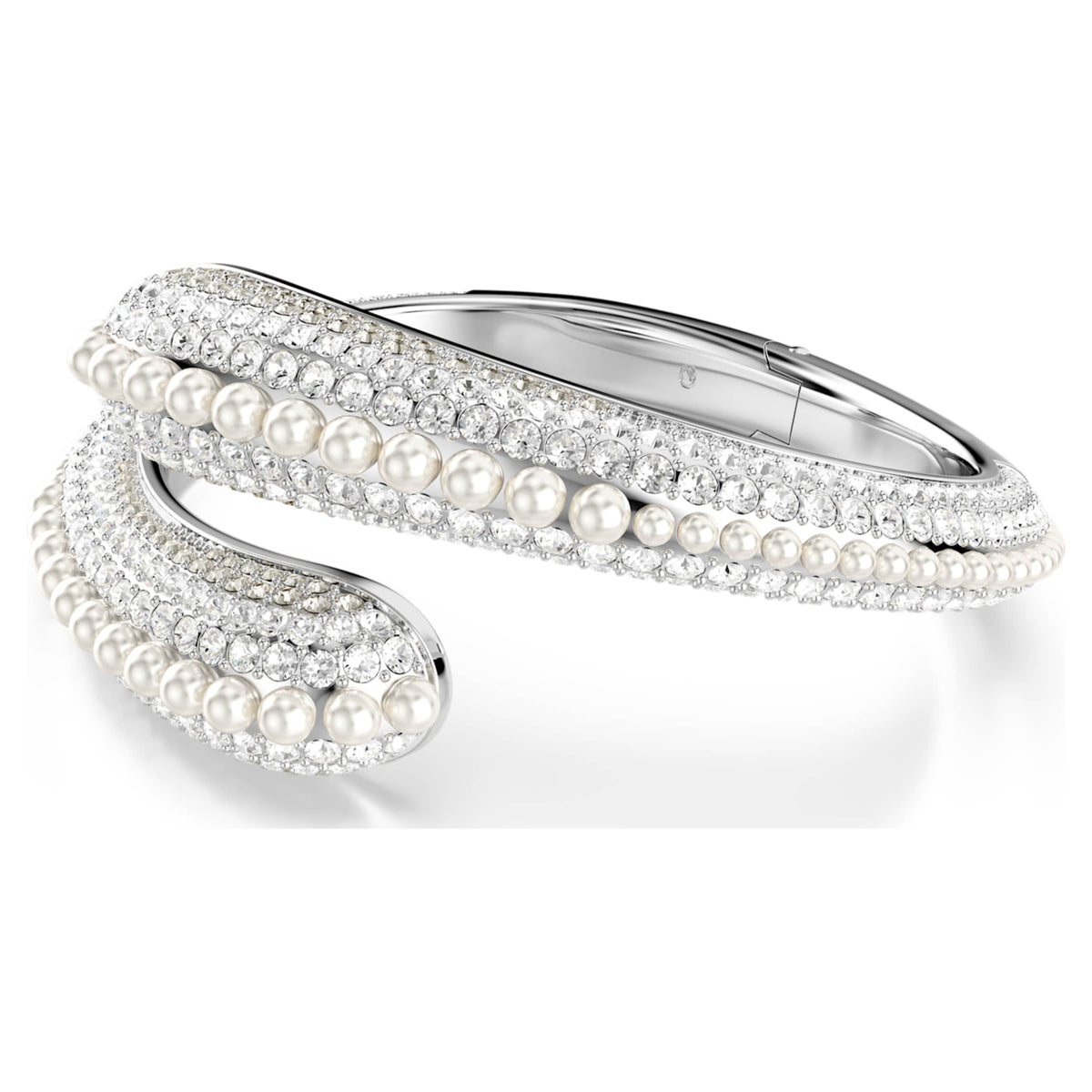 This Sublima Cuff by Swarovski allows you to embrace the power of self-expression through its exquisite and bold design. The rhodium plated jewelry wraps around the wrist with an overlapping silhouette, embellished with three rows of clear crystals and luminous white Swarovski Crystal Pearls. The Meteora pattern of varying crystal sizes creates a mesmerizing effect that catches light from every direction. This piece symbolizes modern strength and the beauty of diversity in design. It is a bold statement style that provides a luxurious finish to any outfit, making it ideal for the woman who wants to stand out.