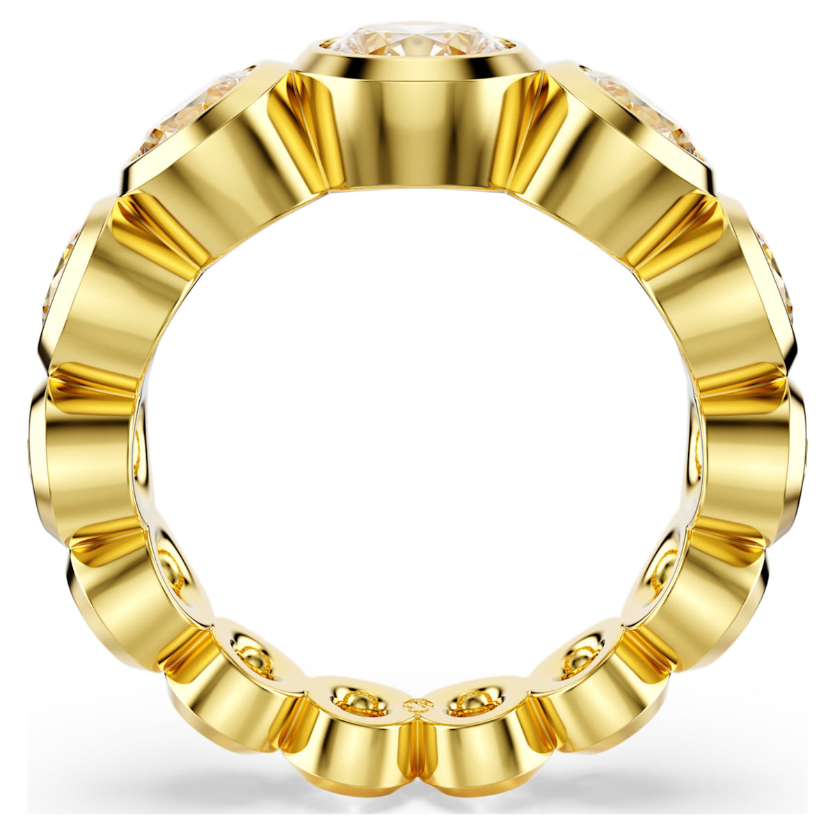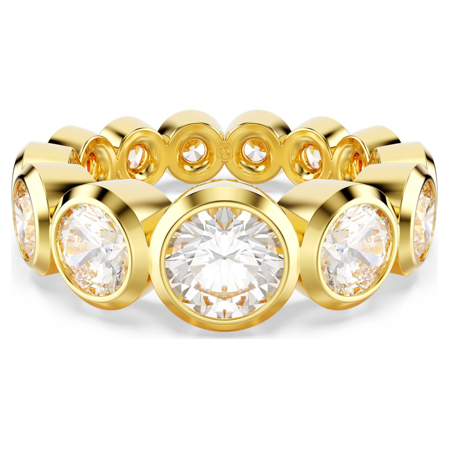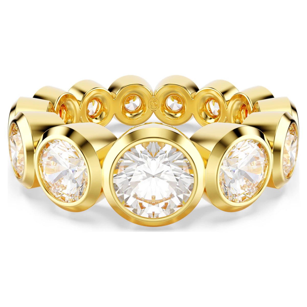 This Imber Ring by Swarovski is ideal for day-to-night styling, remaining impressive at any hour. The gold-tone plated band is masterfully crafted with a full circle of round-cut Swarovski Zirconia, each placed in a modern bezel setting. A gradient of different sizes produces an eye-catching effect and a blaze of light from any angle. This ring symbolizes the continuous cycle of brilliance and modern elegance. Wear it with a pair of matching earrings to let your sophistication shine. Its comfortable design and radiant finish make it an essential staple for any high-end jewelry collection.