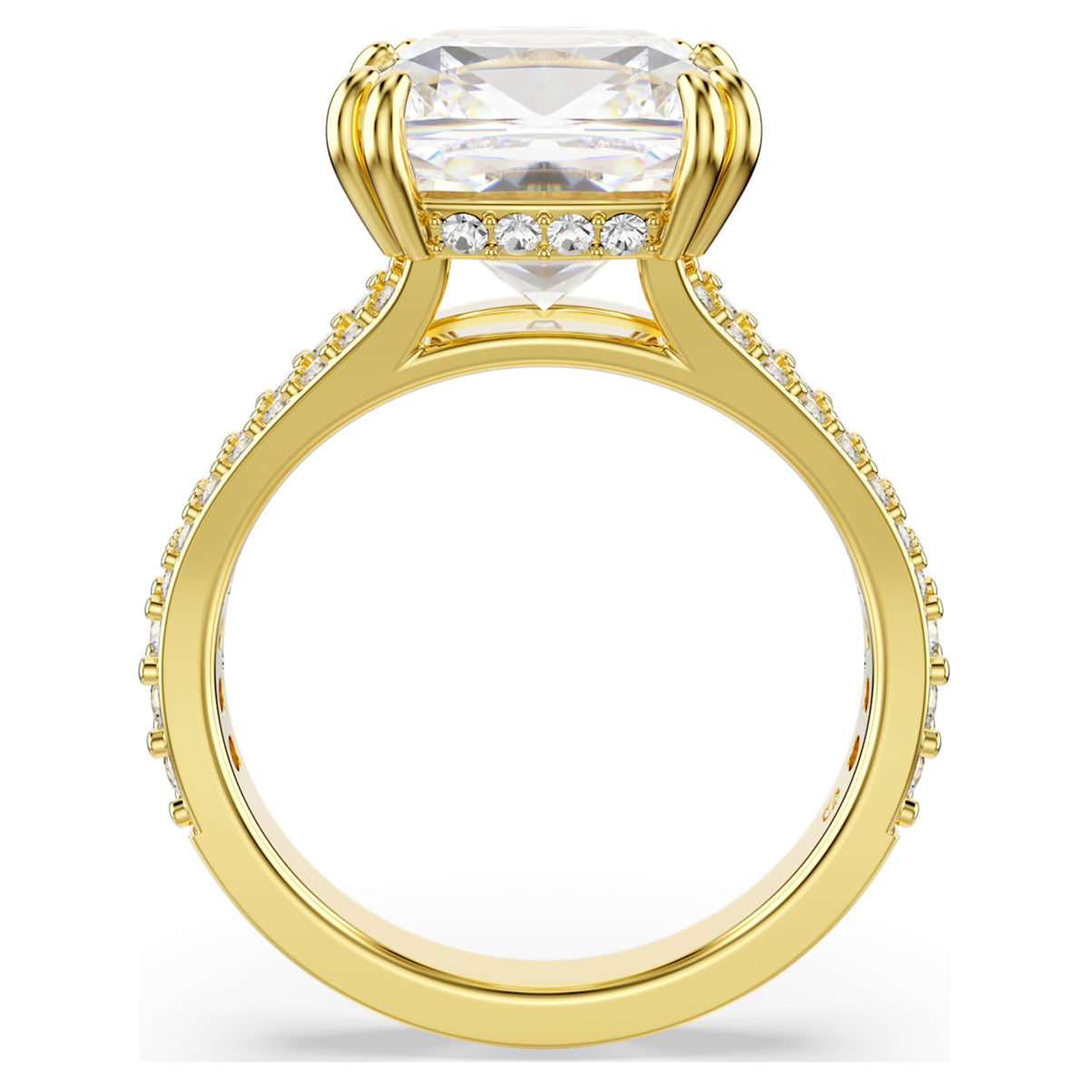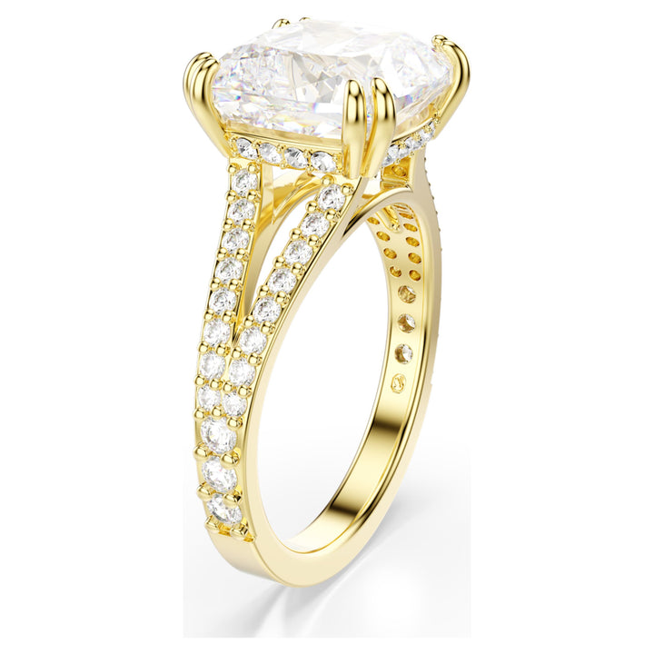 This Stilla Cocktail Ring by Swarovski is made for the spotlight, striking the perfect balance between high-end drama and refined elegance. The design features an exquisite square-cut Swarovski Zirconia held securely in a double-prong setting to maximize its brilliance. The ring is finished with a pavé-embellished gallery and a polished gold-tone plated band that adds a touch of warm luxury. This piece symbolizes confidence and the beauty of a singular focus. It is an ideal statement accessory for special occasions where you want to shine bright, providing a sophisticated and radiant finish to your evening attire.