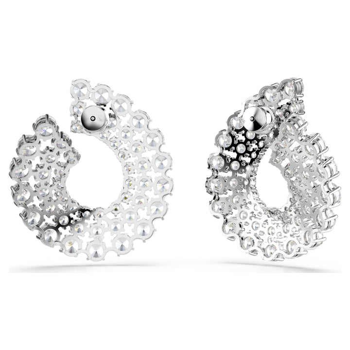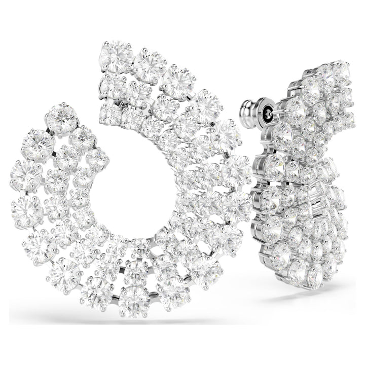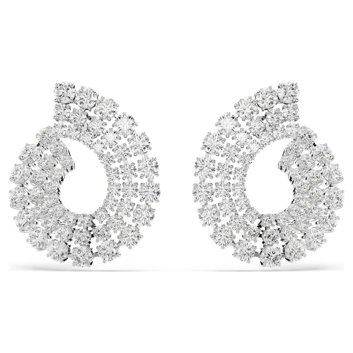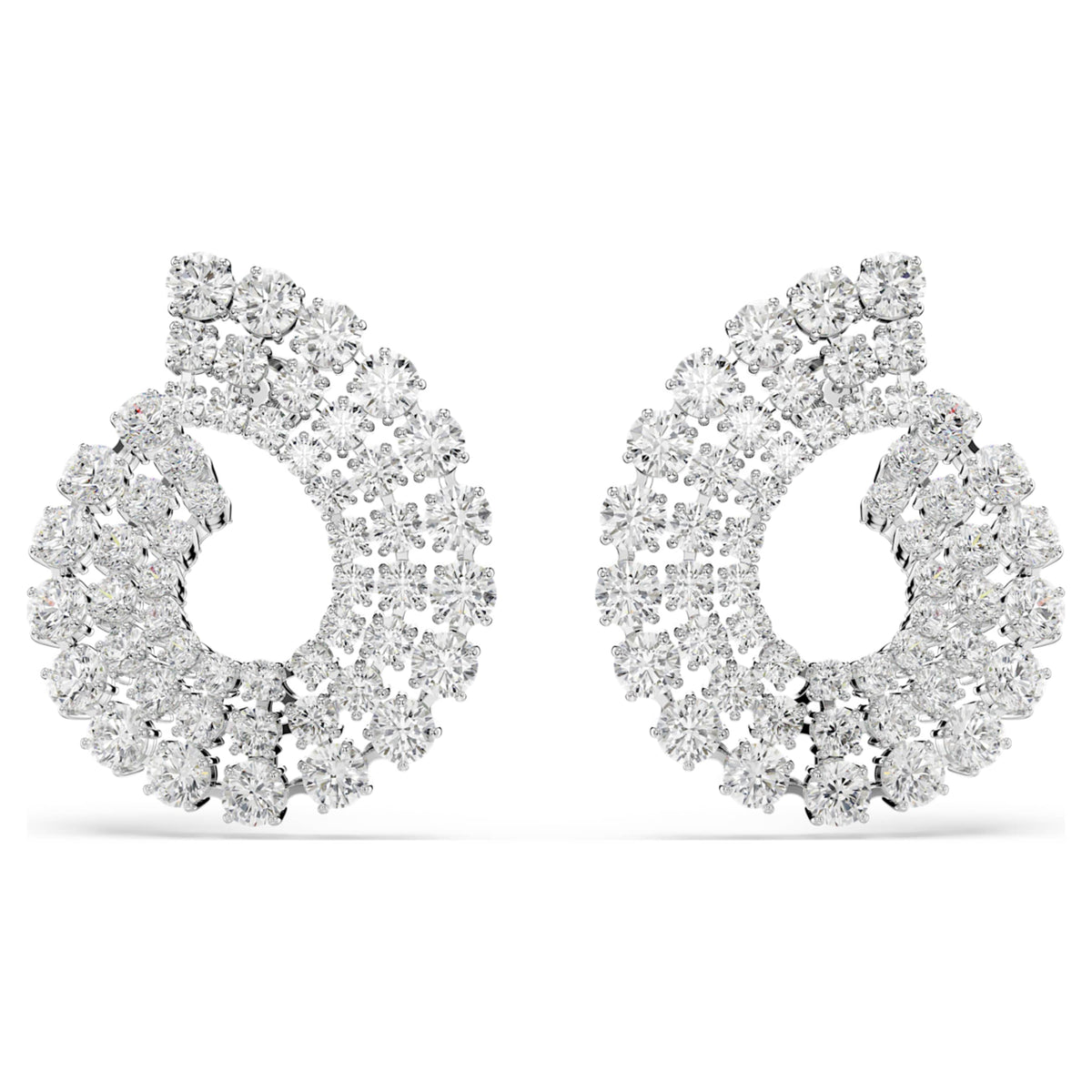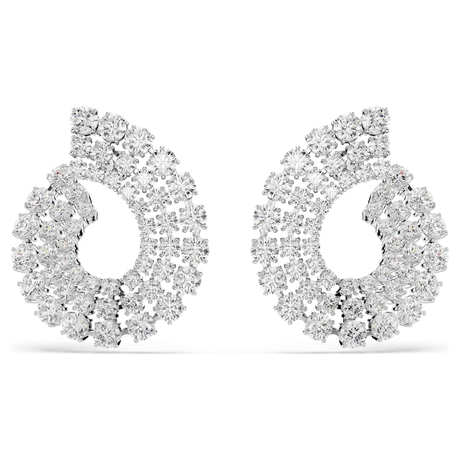 These Matrix Hoop Earrings Mixed Round Cuts White Rhodium Plated by Swarovski showcase sculptural elegance through spiraling forms of radiant zirconia. Each hoop features three layered rows of round cut stones in varying sizes, creating depth and dynamic sparkle. The design symbolizes harmony and brilliance, reflecting light from every angle. Refined yet striking, these earrings elevate everyday styling while transitioning seamlessly into evening wear. A modern interpretation of glamour that highlights Swarovski’s expertise in precision setting and luminous design.