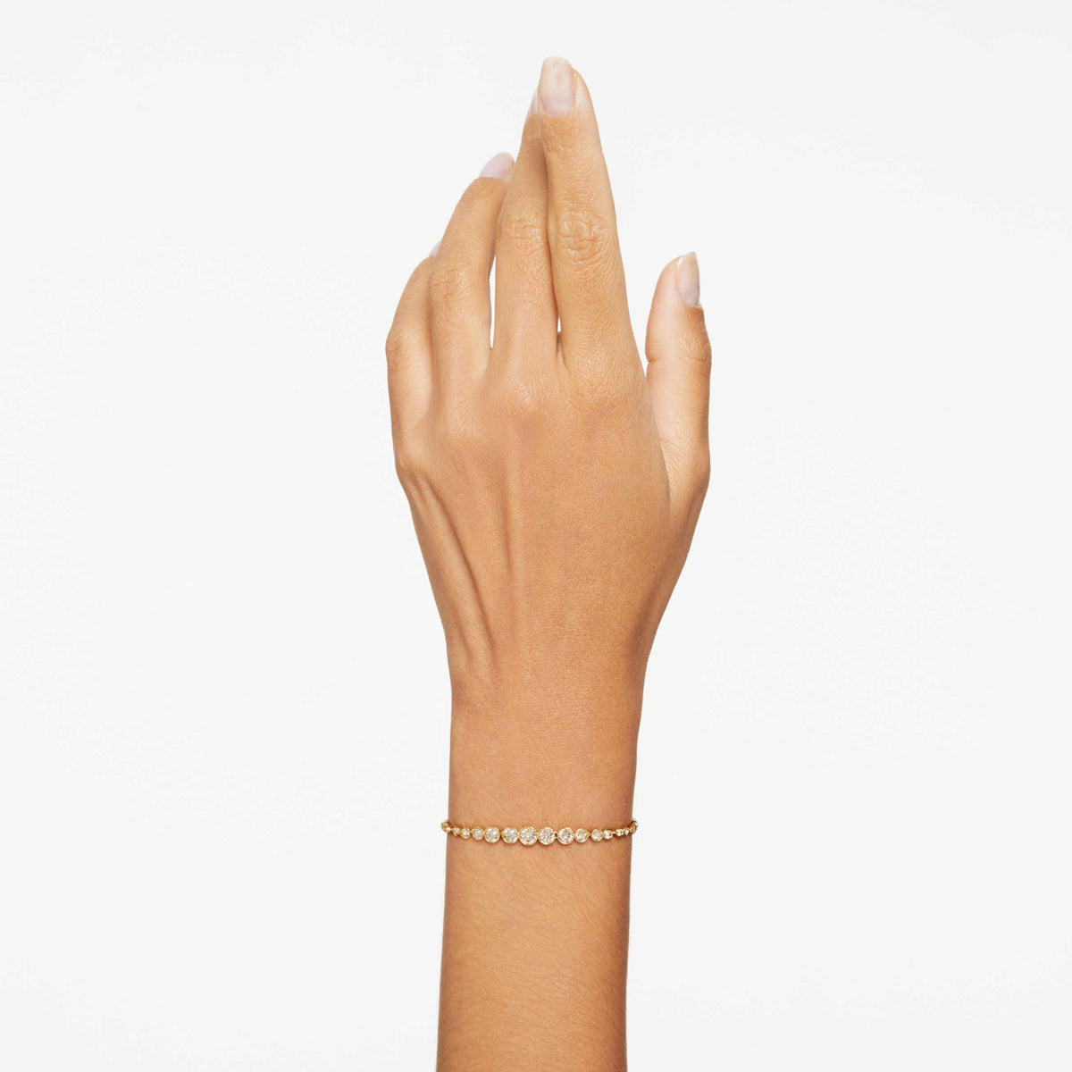 This Imber Emily Bracelet Mixed Round Cuts Gold Tone Gold Tone Plated by Swarovski radiates warmth and timeless elegance through its softly graduated golden crystals. Each round stone adds gentle brilliance, creating a refined rhythm of light across the wrist. Symbolizing optimism and everyday luxury, the bracelet is designed for effortless styling and easy layering. The gold tone finish enhances richness while maintaining versatility. Finished with a sliding clasp for comfort and adjustability, this piece transitions seamlessly from casual looks to polished moments with understated Swarovski sparkle.