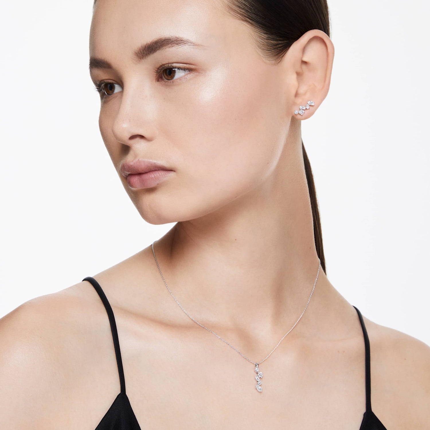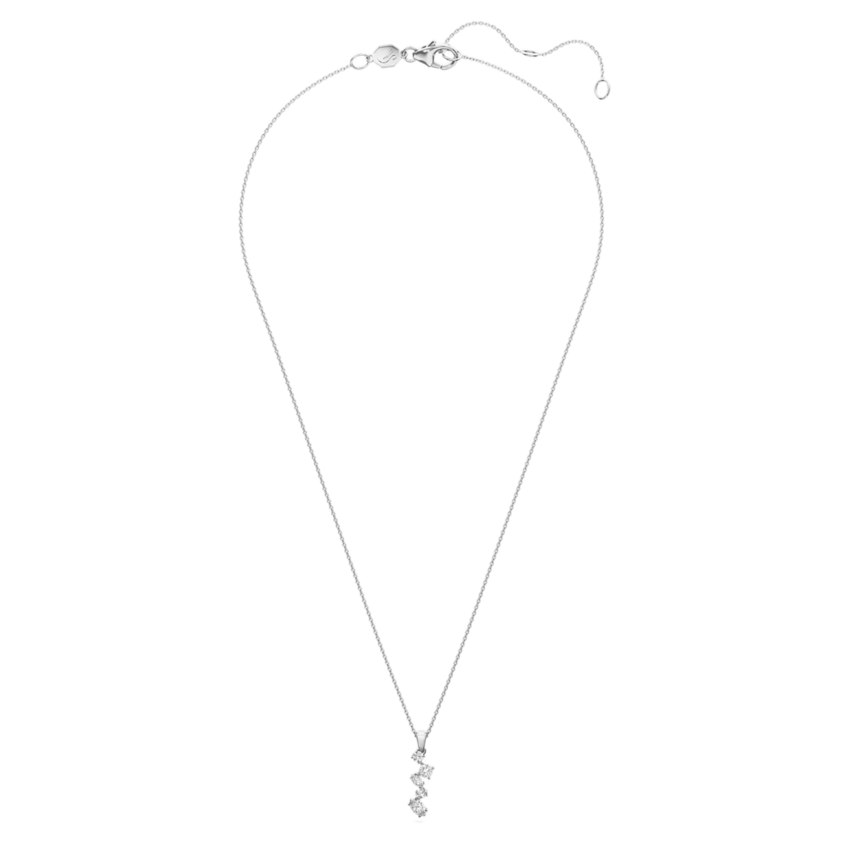 This Galaxy Pendant by Swarovski captures the essence of playful elegance and modern luxury. Presented on a delicate 14K white gold chain with a secure lobster closure, the design features five laboratory grown diamonds in various sizes and shapes. These stones are positioned at different angles to create a dynamic, light-catching effect that mimics the movement of celestial bodies. Part of the Galaxy collection by Giovanna Engelbert, this IGI certified pendant is a sophisticated choice for those who desire a unique and ethical statement piece that enhances any neckline.