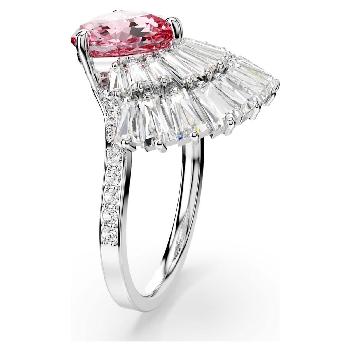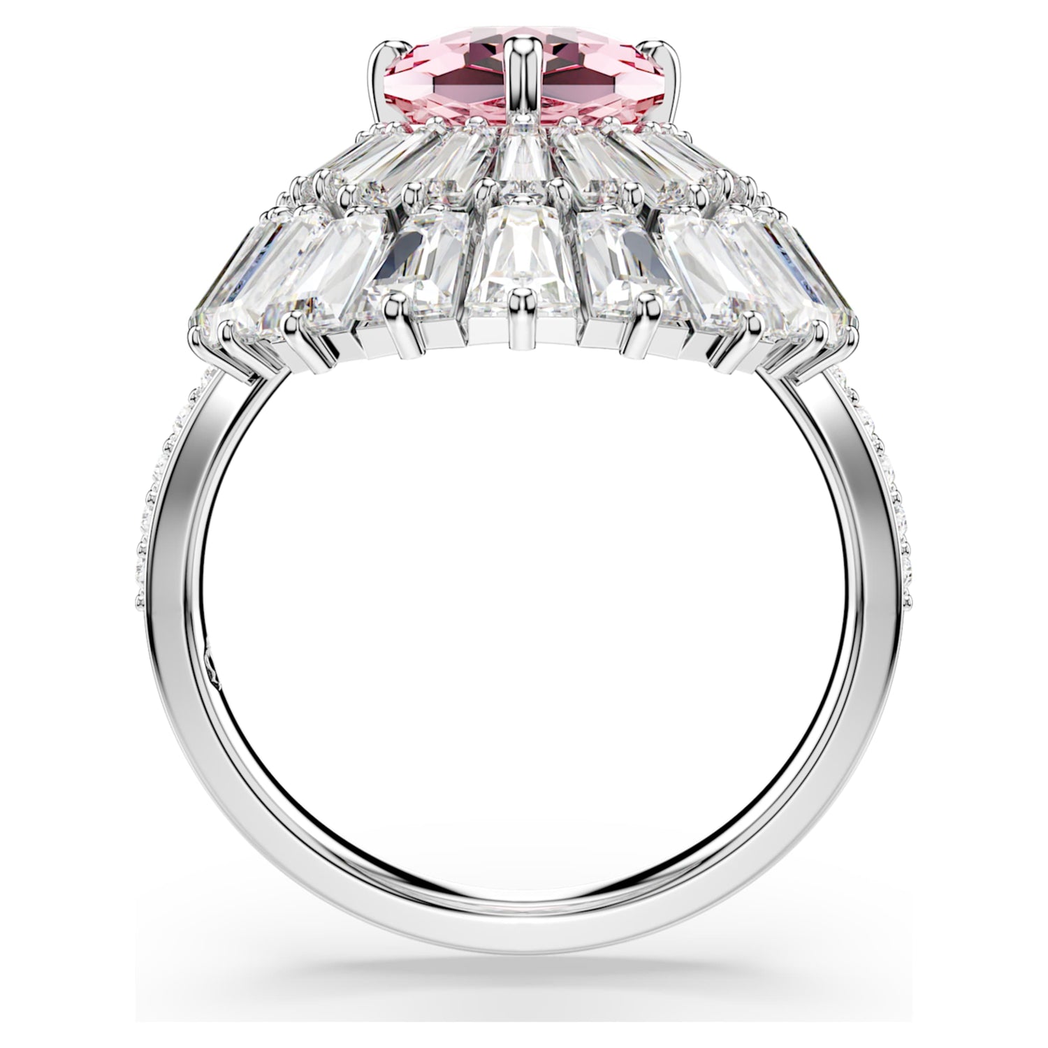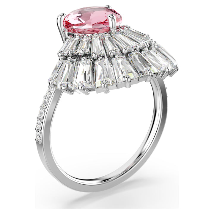 This rhodium-plated ring is embellished with clear Swarovski Zirconia and a central pink crystal in an intricate shell-inspired motif.