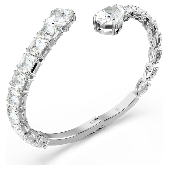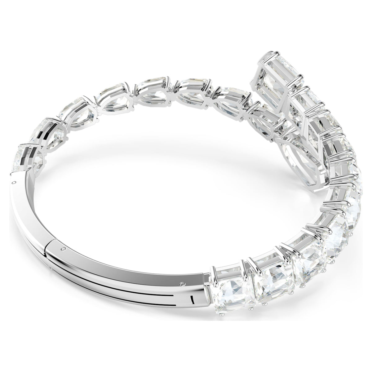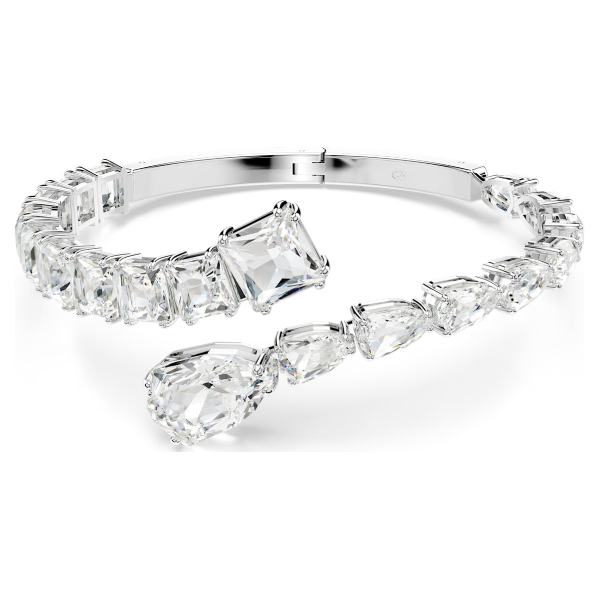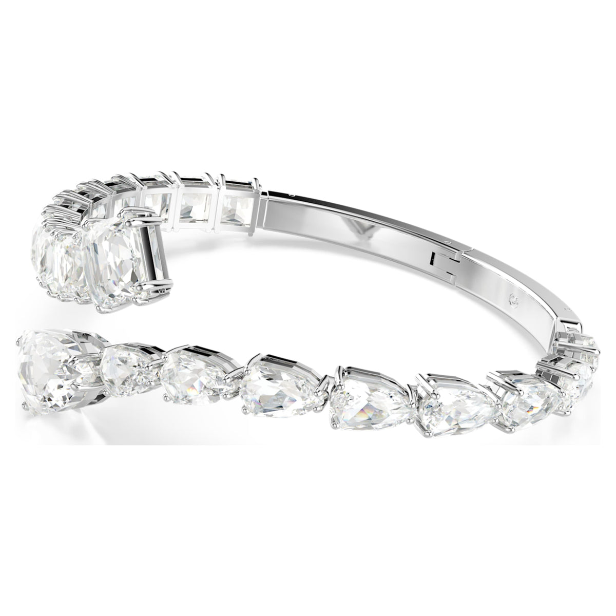 This rhodium-plated cuff features a spiral design set with clear Swarovski crystals in pear and square cuts with a Wonderclick closure.