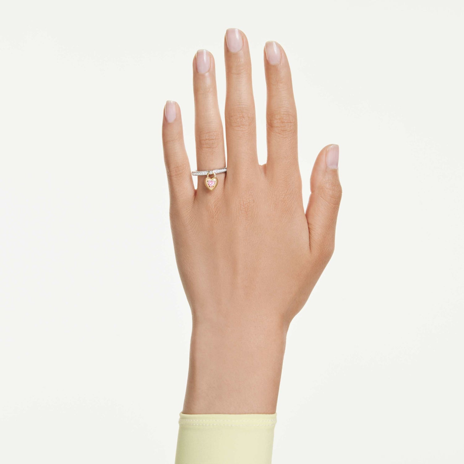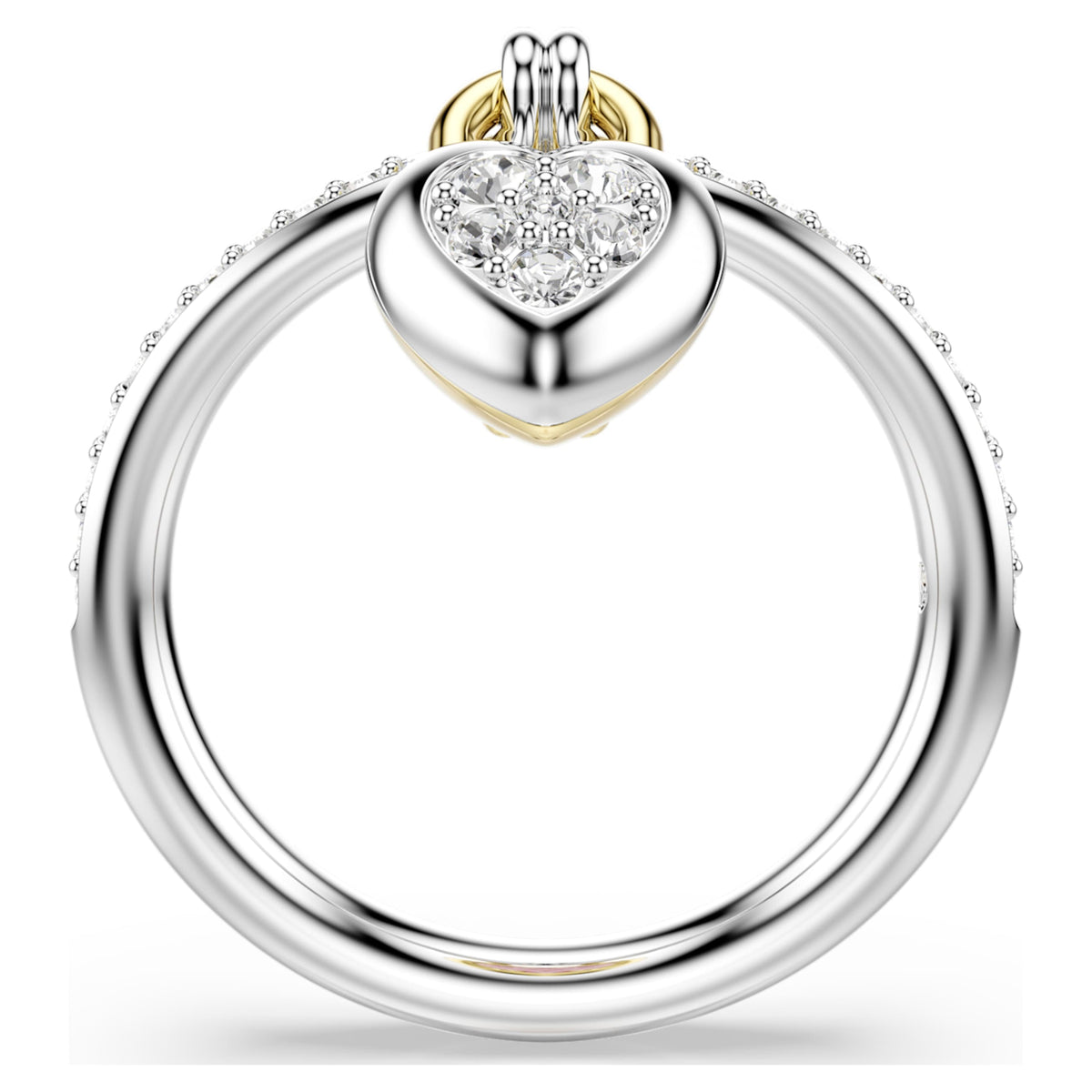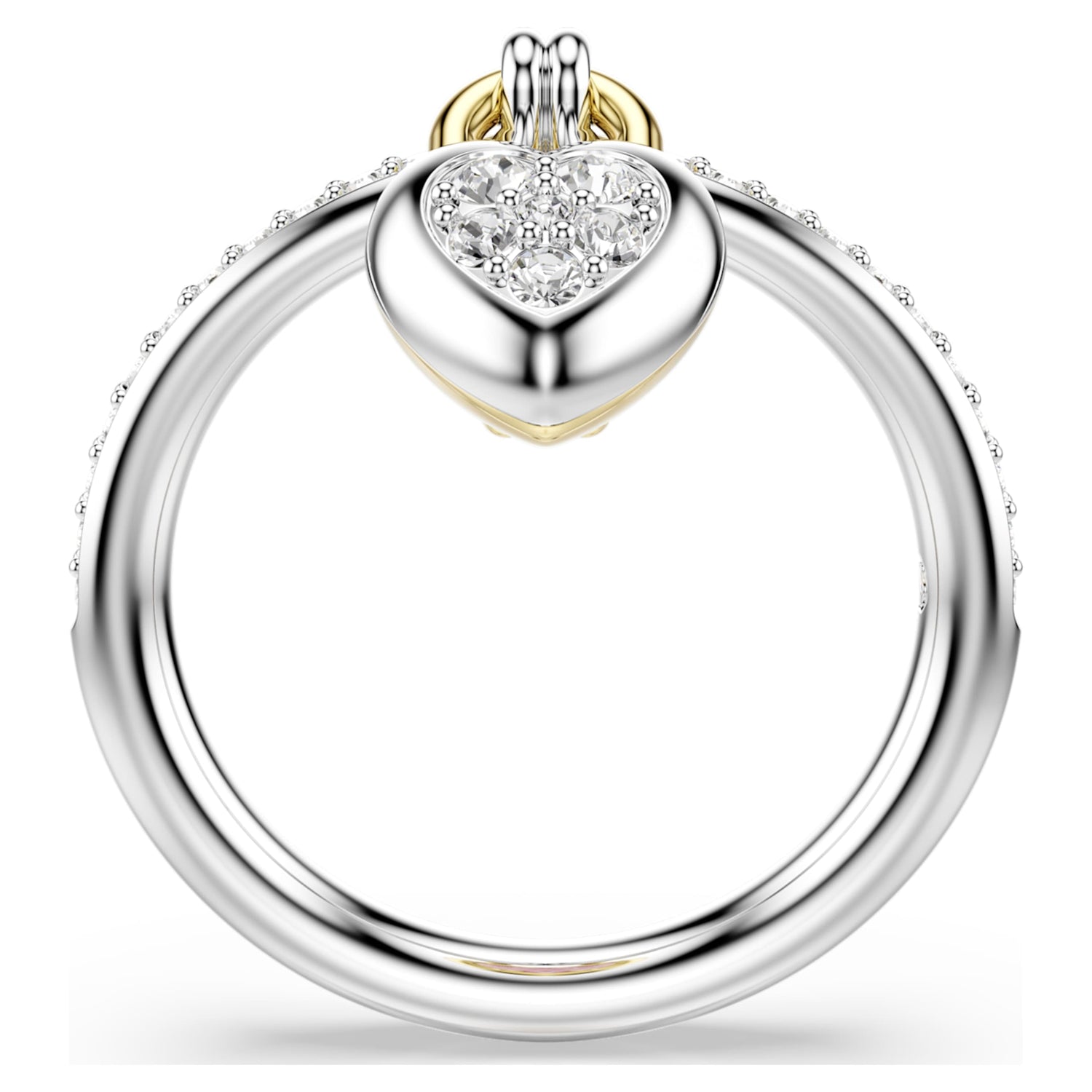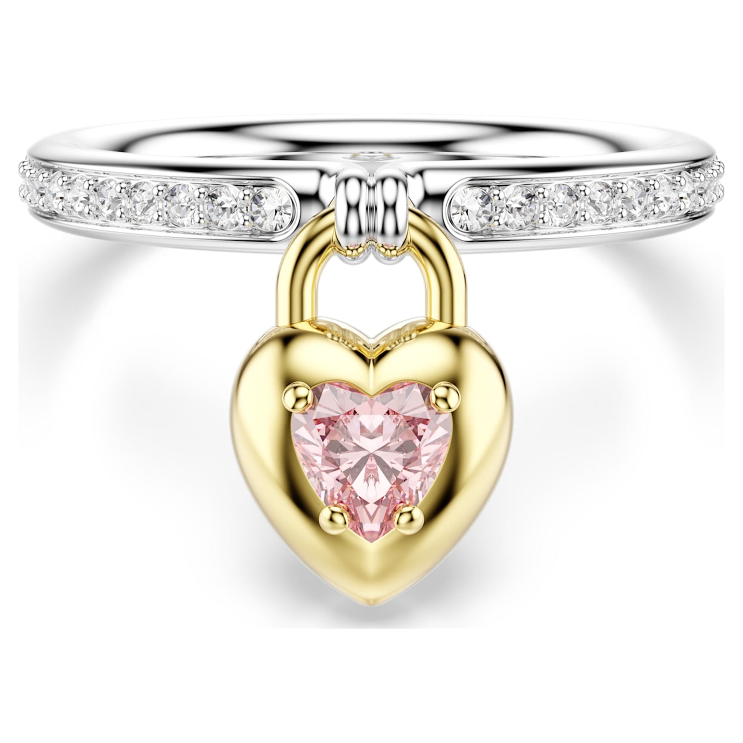 This Idyllia Motif Ring by Swarovski serves as a beautiful symbol of devotion, perfect for adding a romantic touch to your daily style. The slender band is meticulously paved with clear crystals and features a central, locket-inspired heart. Designed for versatility, the motif features a pink Swarovski Zirconia heart in gold-tone plating on one side and clear pavé in rhodium plating on the other. This mixed-metal approach allows you to switch your look effortlessly. Pair it with the matching bangle to celebrate love in all its brilliant, shimmering forms.