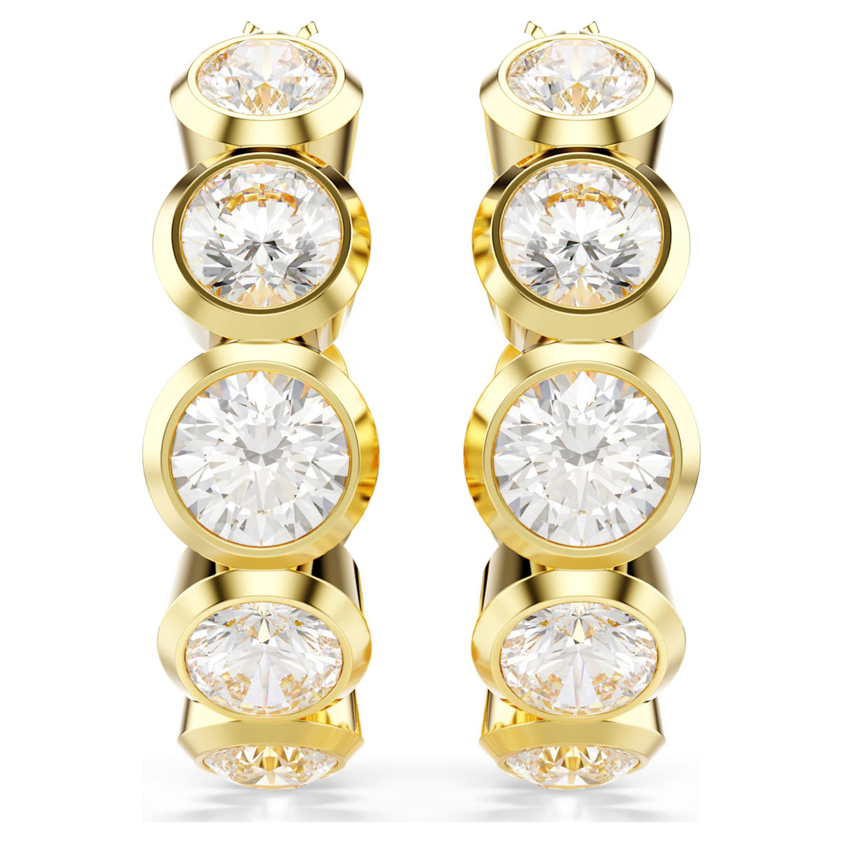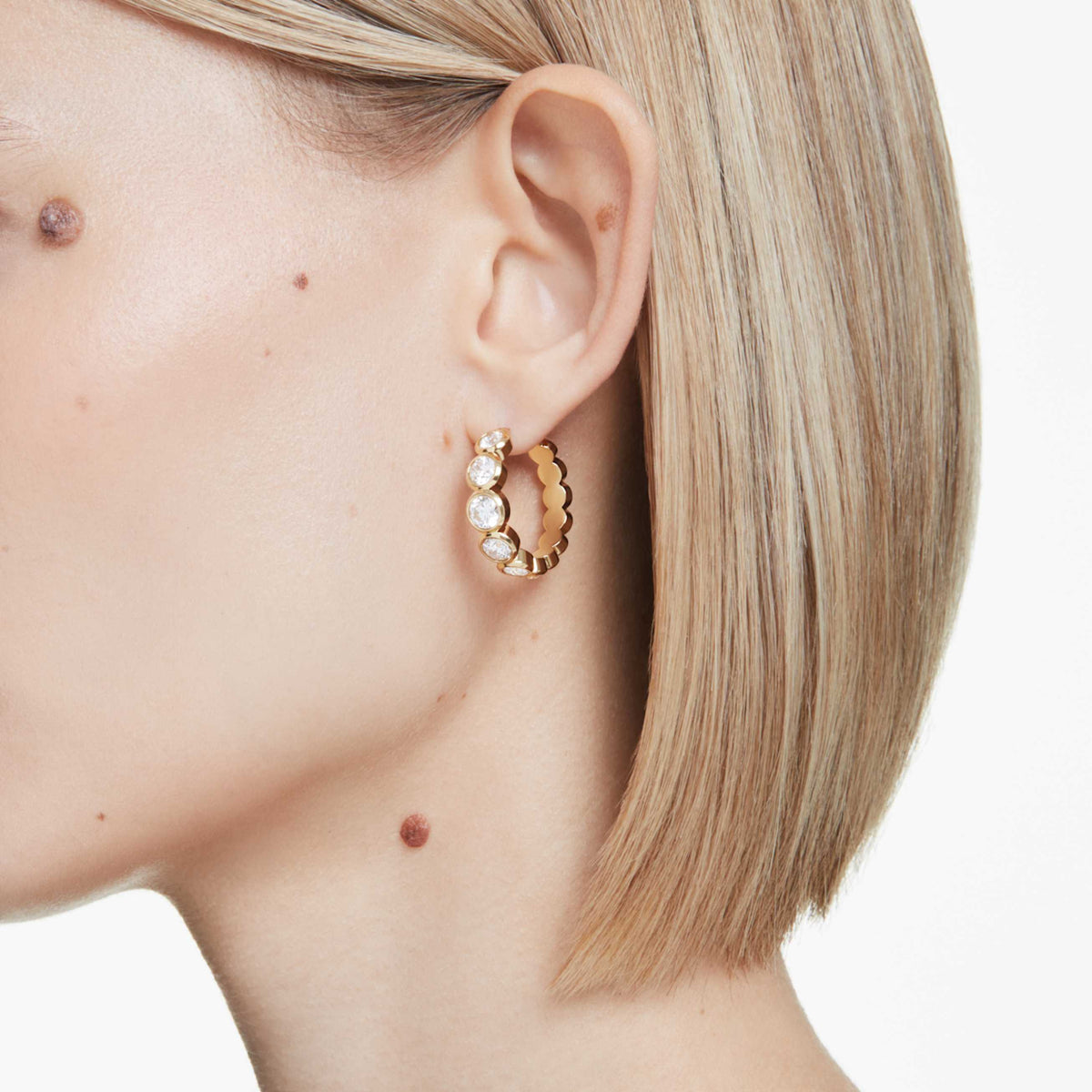 These Imber Hoop Earrings by Swarovski are designed to maximize your elegance with a masterfully crafted, radiant silhouette. These gold-tone plated mini hoops feature a continuous circle of round-cut Swarovski Zirconia, presented in a sophisticated gradient of sizes. Each stone is placed in a modern bezel setting, providing a sleek and polished finish that catches the light beautifully. These earrings are a perfect choice for everyday sophistication or a glowing touch of evening glamour. They symbolize a refined sense of luxury, blending classic hoop aesthetics with contemporary, precision-led jewelry craftsmanship and radiant brilliance.