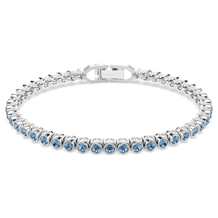 This rhodium-plated tennis bracelet features bezel-set round blue Swarovski crystals and a foldover clasp closure.